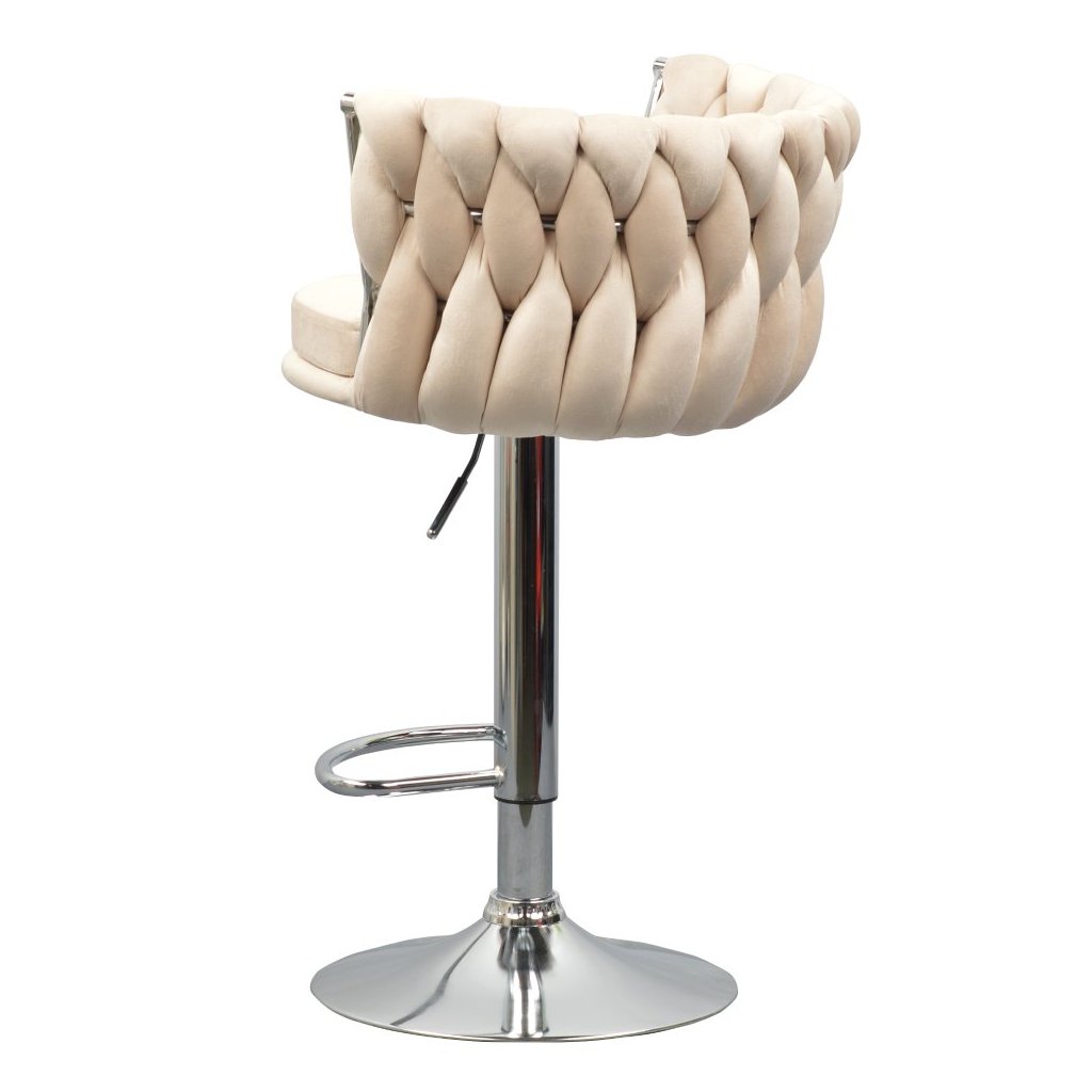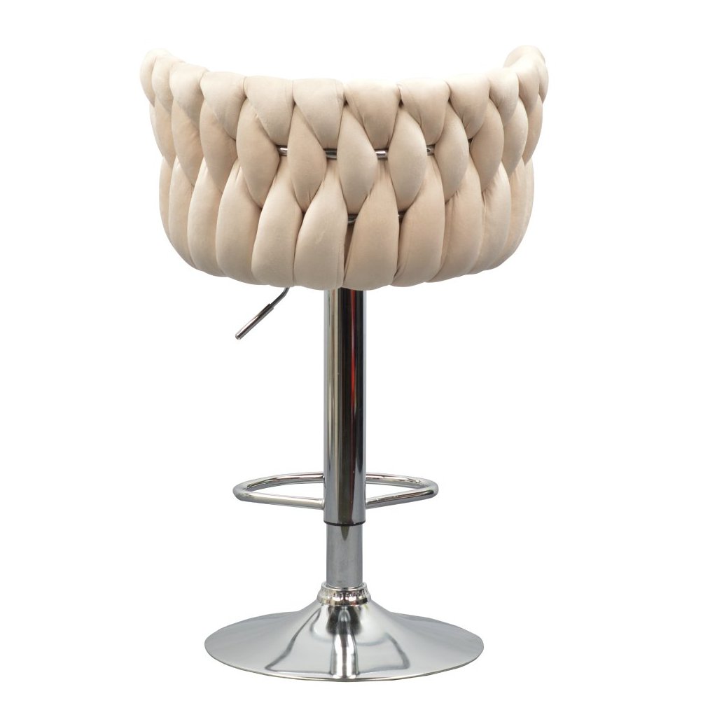 Dizajnová barová stolička BRIN v béžovej zamatovej látke je ideálnym doplnkom moderných interiérov. Je výškovo nastaviteľná, otočná a stabilná vďaka chrómovej konštrukcii. Elegantná a pohodlná!