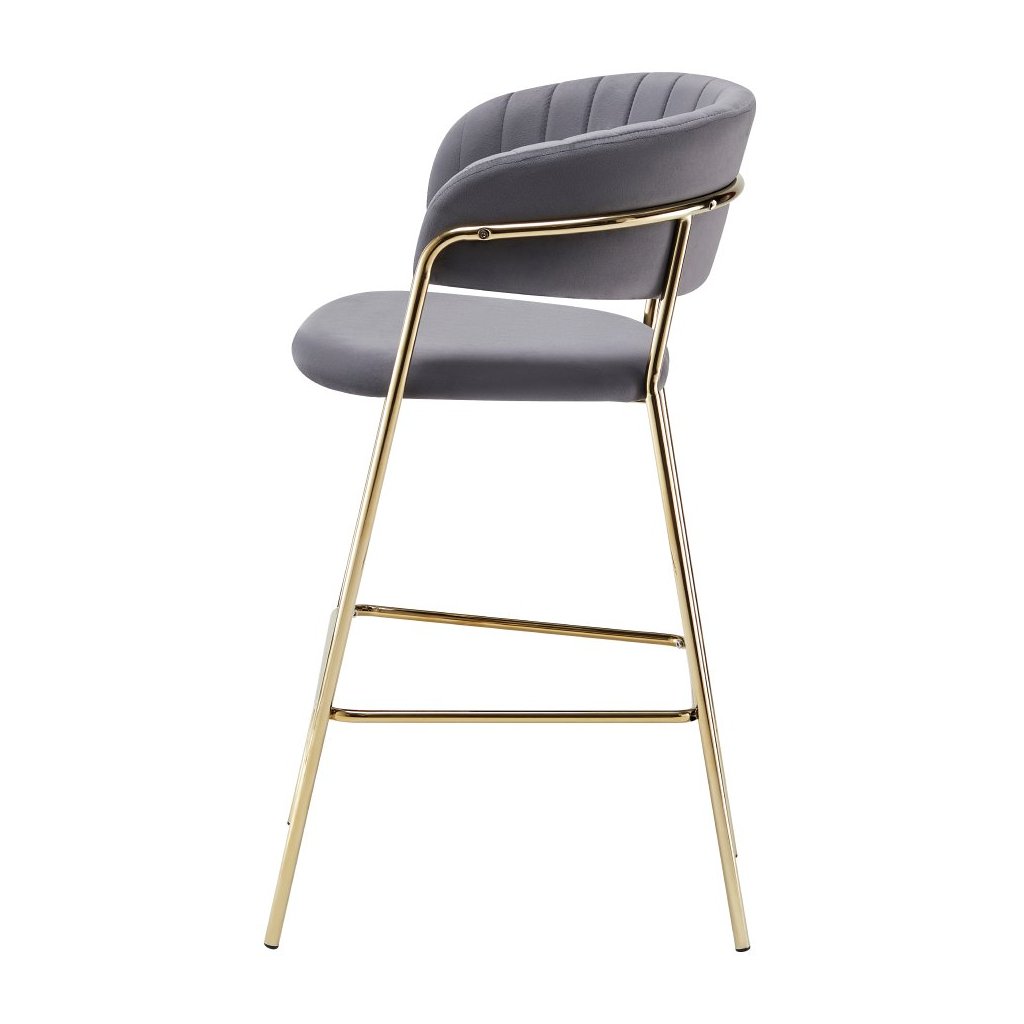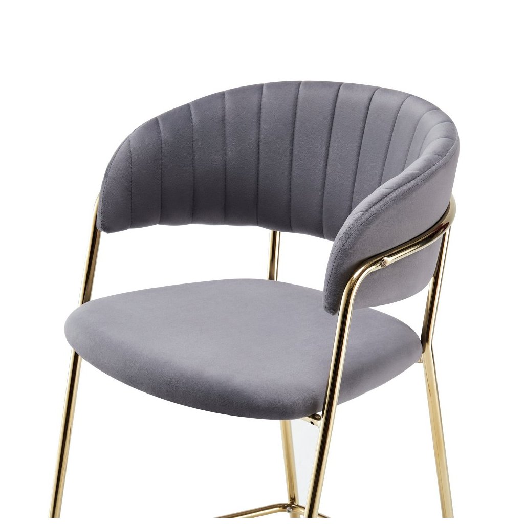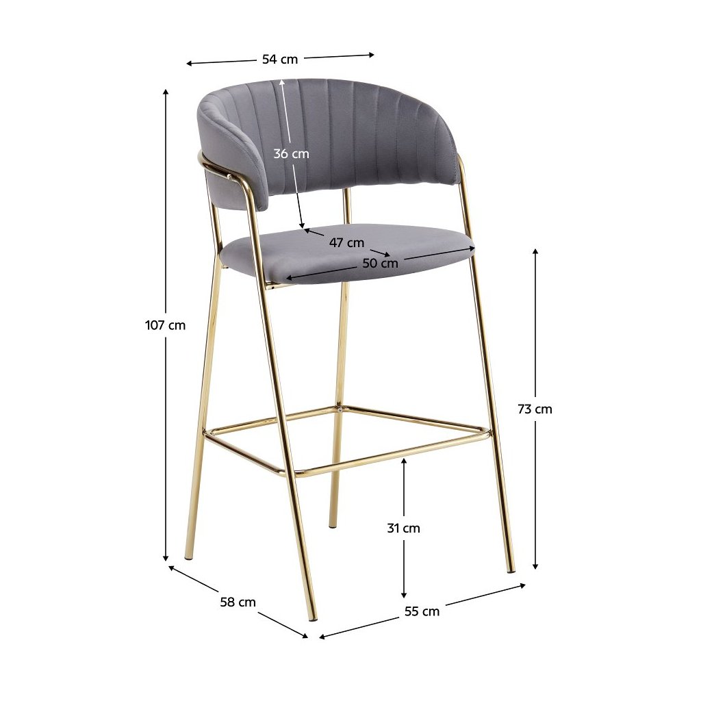 Barová stolička DASMIN v elegantnej sivohnedej zamatovej látke s chrómovou konštrukciou v zlatom prevedení prináša moderný štýl a komfort. Ideálna do kuchyne, kaviarne či reštaurácie.