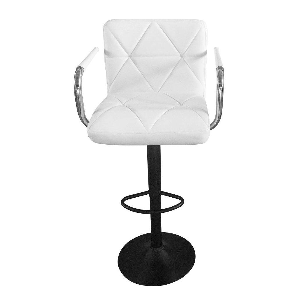 Barová stolička FABIOLA v bielej ekokoži je elegantným doplnkom moderného interiéru. Otočné a výškovo nastaviteľné sedadlo s opierkami na ruky zabezpečuje pohodlie. Čierna kovová podstava garantuje st