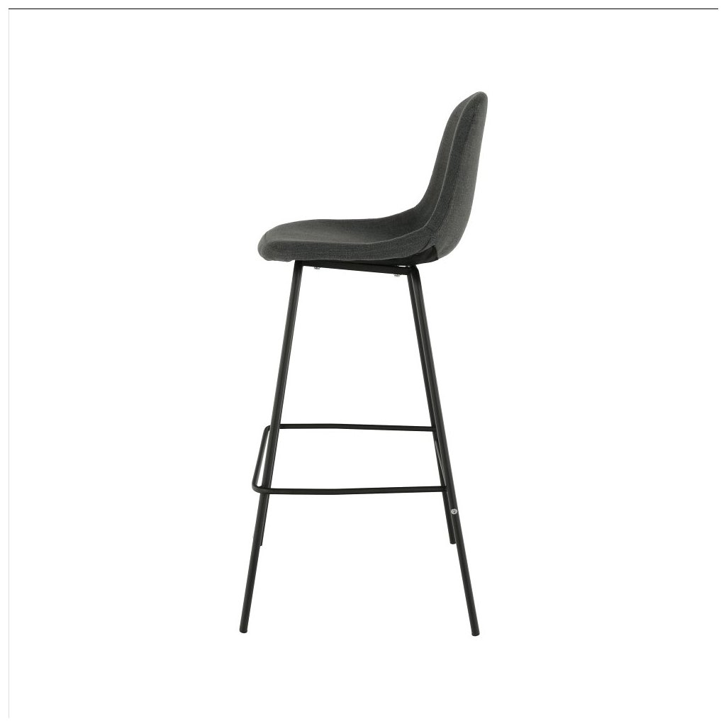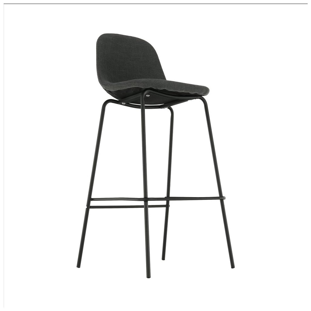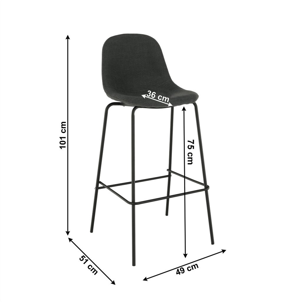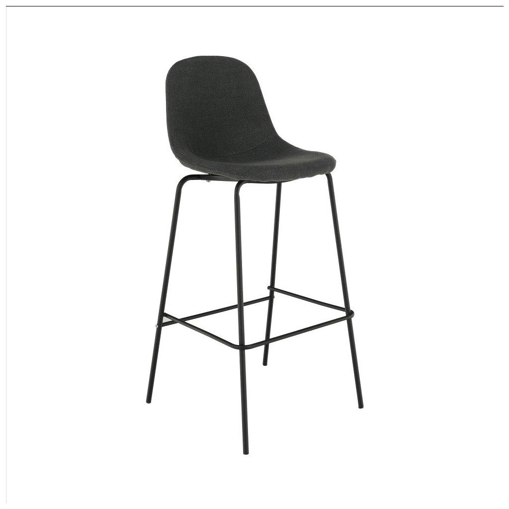 Barová stolička MARIOLA v tmavosivej látke kombinuje štýlový dizajn a pohodlie. Tvarované sedadlo a stabilná čierna kovová konštrukcia sú ideálne pre moderné interiéry. Nosnosť 90 kg.