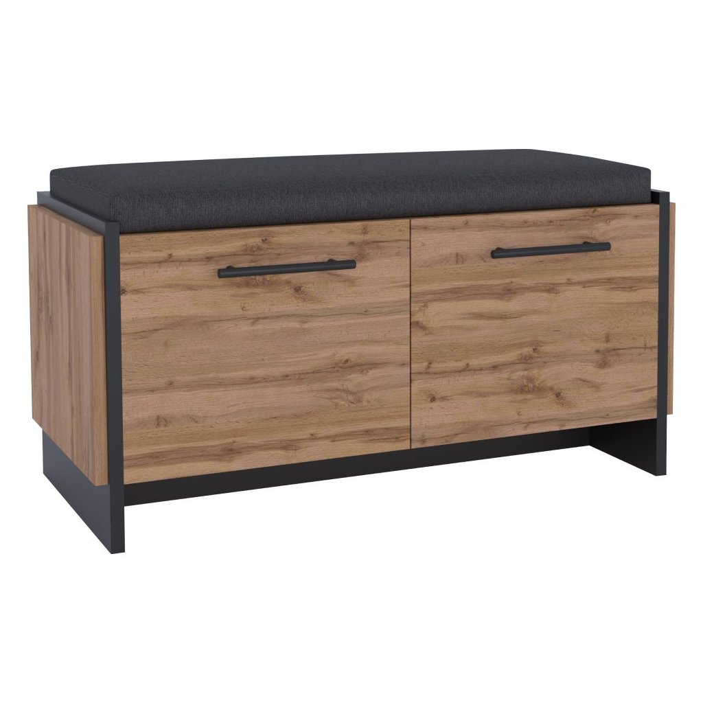Botník AMONI v dekore dub wotan a čiernej farbe poskytuje praktický úložný priestor. Dvojdverový dizajn s odolnou látkovou poduškou a kovovými úchytkami. Rozmery: 96x45x45 cm. Dodávané v demonte.