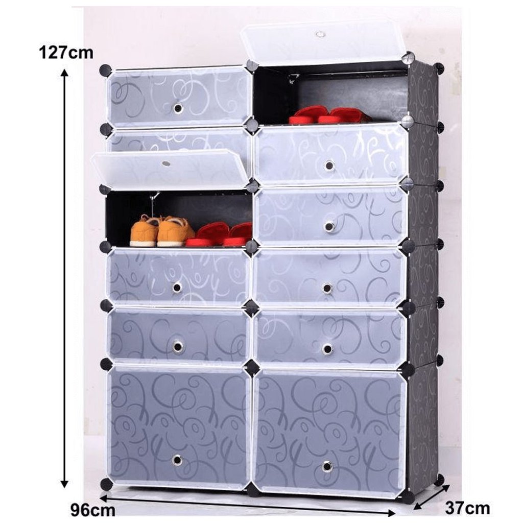 Praktický botník v čiernej a bielej farbe s kovovou konštrukciou a plastovými boxmi. S rozmermi 96x37x127 cm ponúka 10 nižších a 2 vyššie úložné boxy pre efektívne usporiadanie obuvi. Vhodný do predsi
