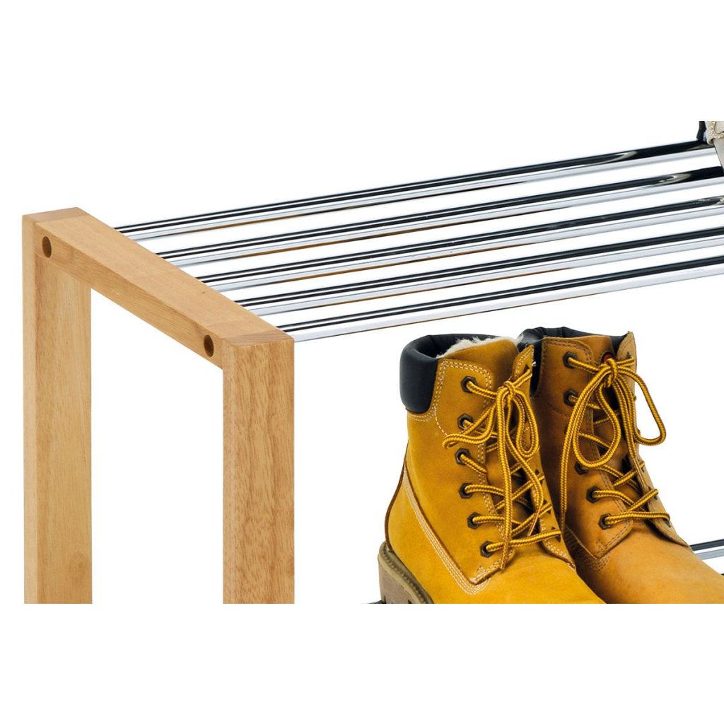 Botník BENI v hnedom prevedení ponúka praktické usporiadanie obuvi s dvoma chrómovanými policami. Masívny rám z kaučukovníka zaisťuje stabilitu a dlhú životnosť. Otvorený dizajn uľahčuje údržbu.