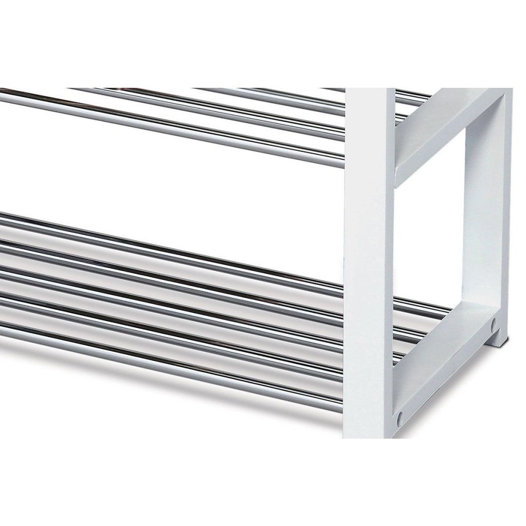 Štyri kovové police poskytujú dostatok priestoru pre vaše obuv, pričom chrómovaný kov je odolný voči poškodeniu a ľahko sa udržiava. Rám z masívneho kaučukovníka zabezpečuje stabilitu a dlhú životnosť celého produktu.