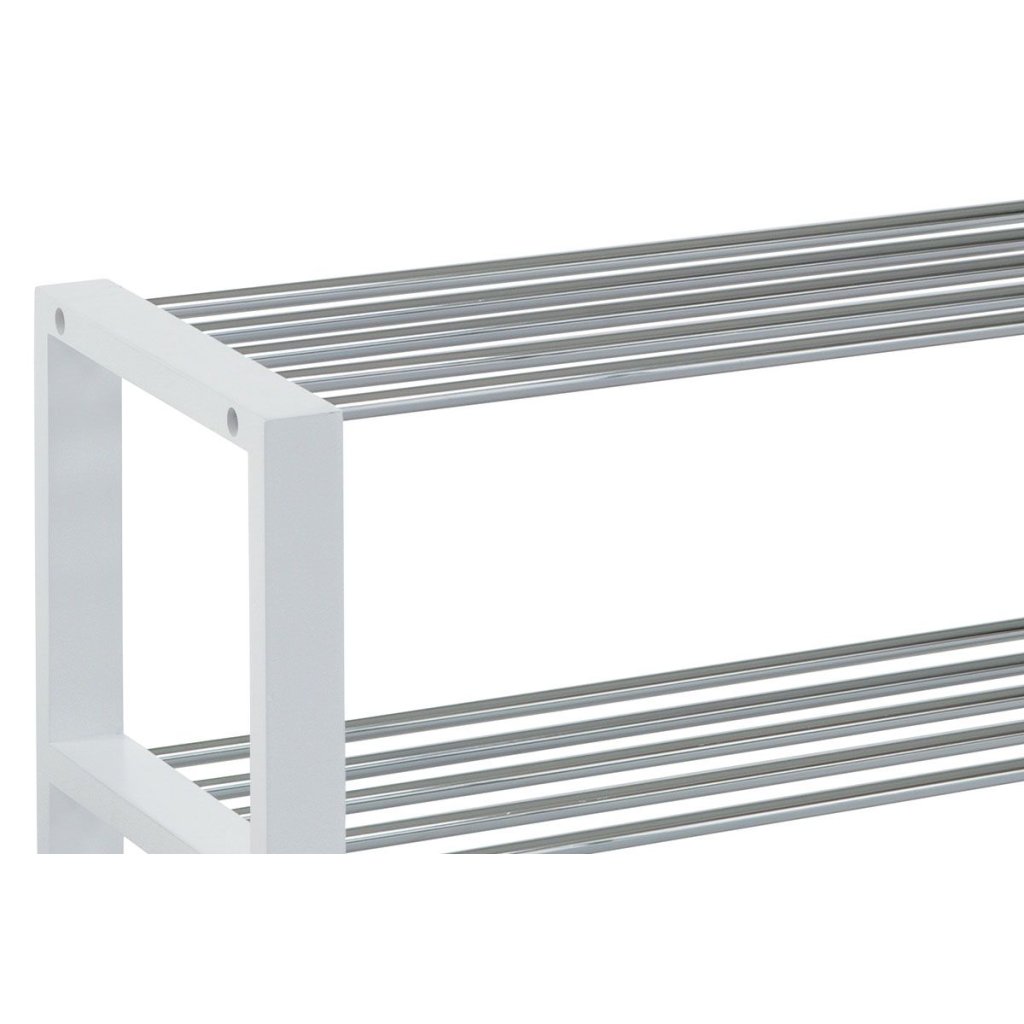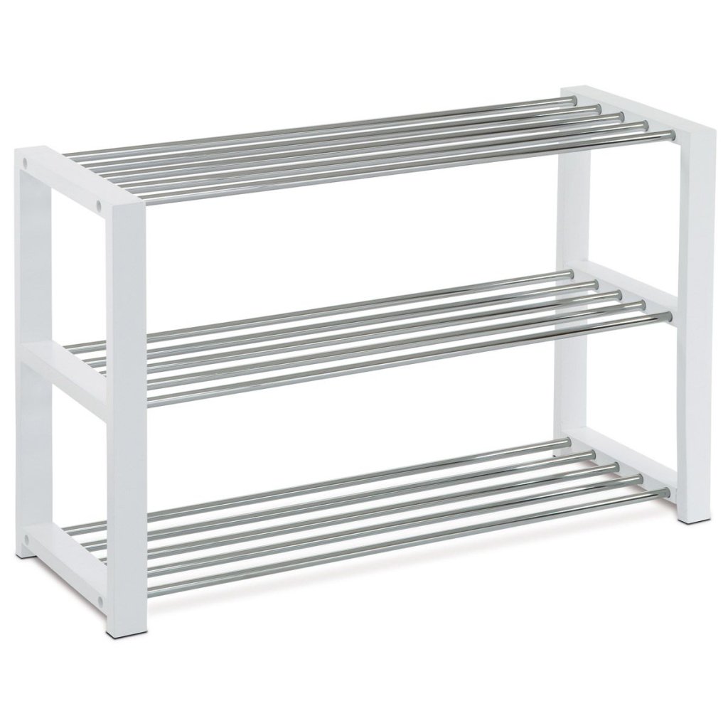 Praktický botník s tromi policami z chrómovaného kovu a masívnym kaučukovým rámom v bielej matnej farbe. Ideálny na usporiadanie obuvi s jednoduchou údržbou a stabilným prevedením.