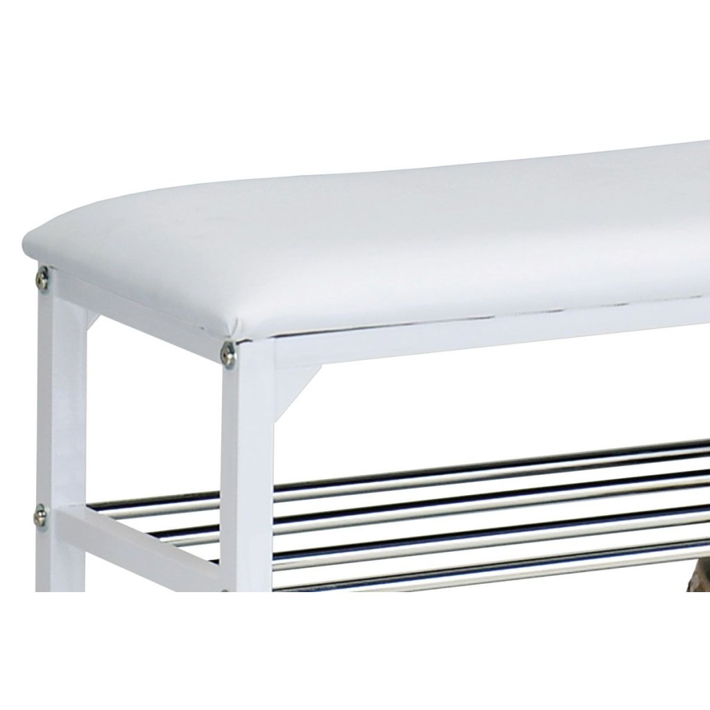 Biely botník s čalúneným sedákom z ekokože kombinuje úložný priestor a komfortné sedenie. Kovová konštrukcia s chrómovanými policami zaručuje odolnosť a moderný dizajn. Ideálny do predsiení.