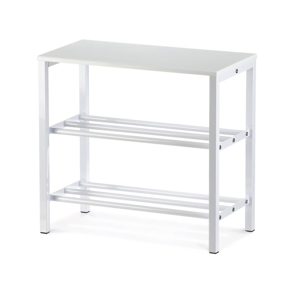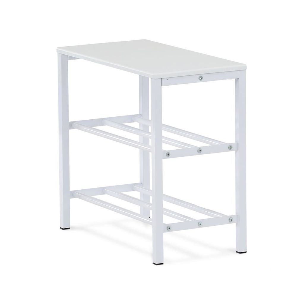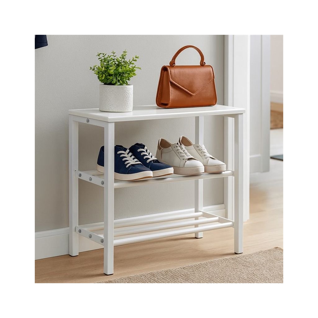 Štýlový biely botník s kovovou konštrukciou ponúka dve priestranné police na obuv a hornú dosku na dekorácie. Minimalistický dizajn sa hodí do každého interiéru.