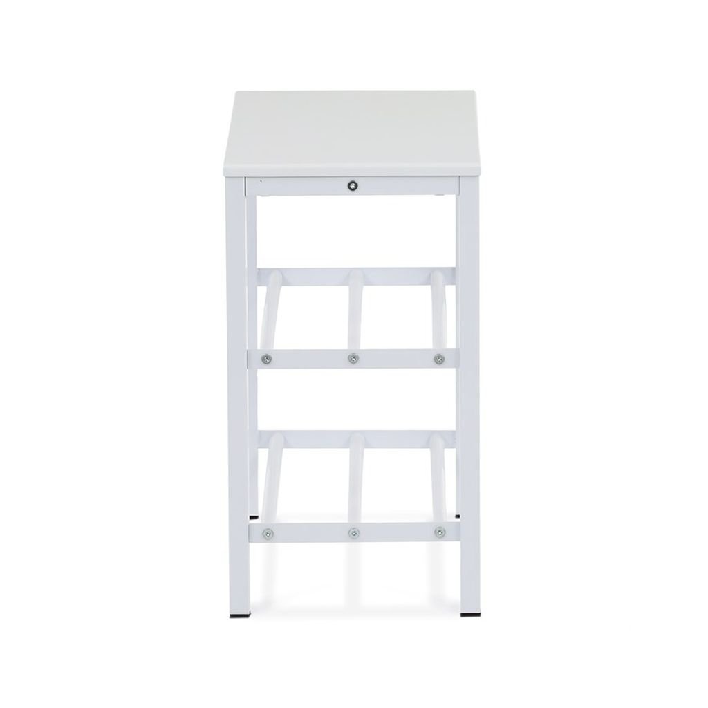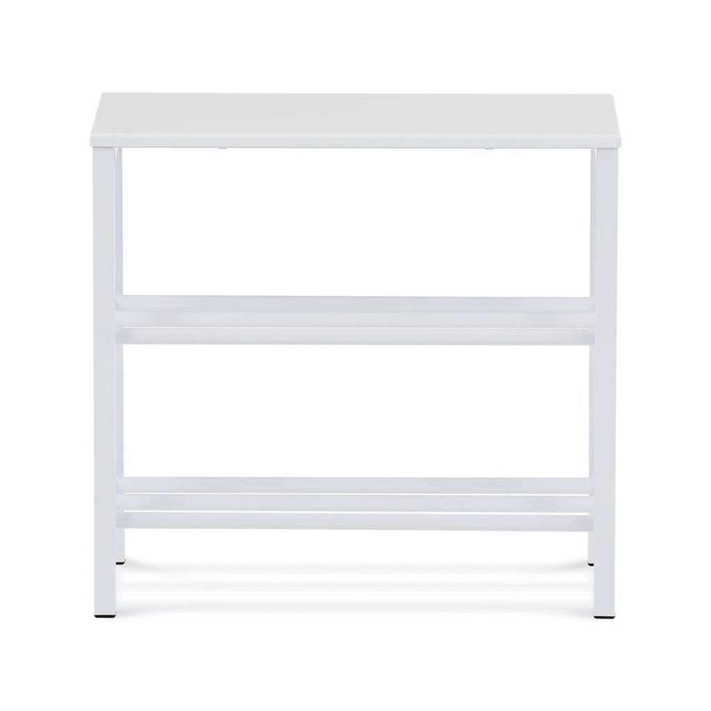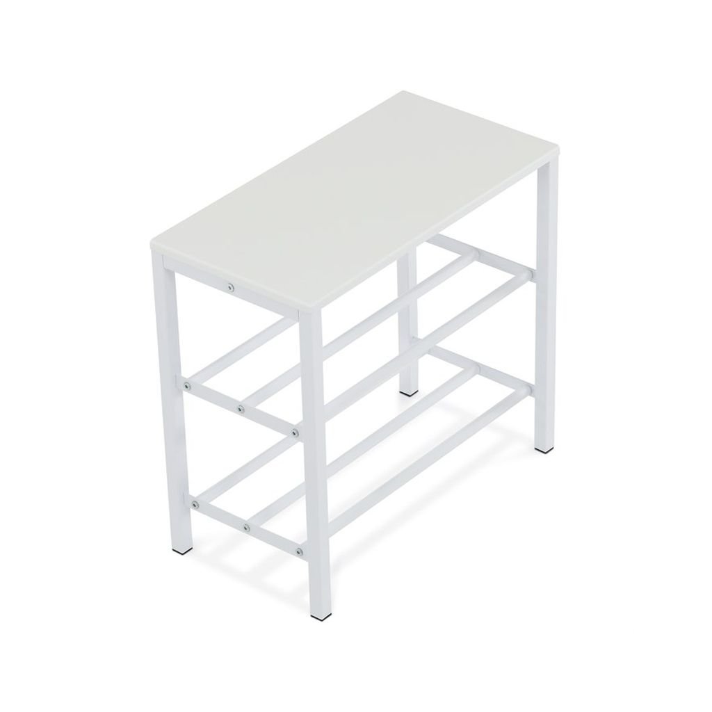 Štýlový biely botník s kovovou konštrukciou ponúka dve priestranné police na obuv a hornú dosku na dekorácie. Minimalistický dizajn sa hodí do každého interiéru.
