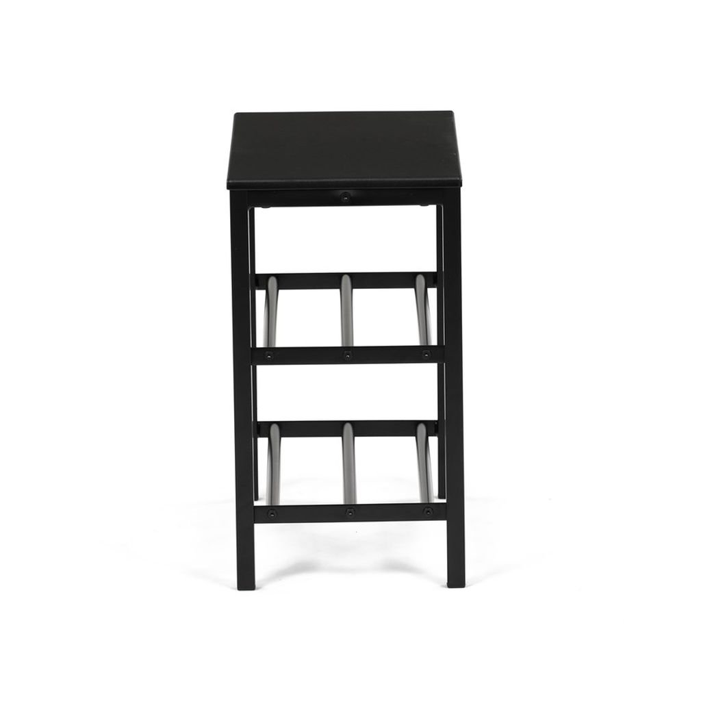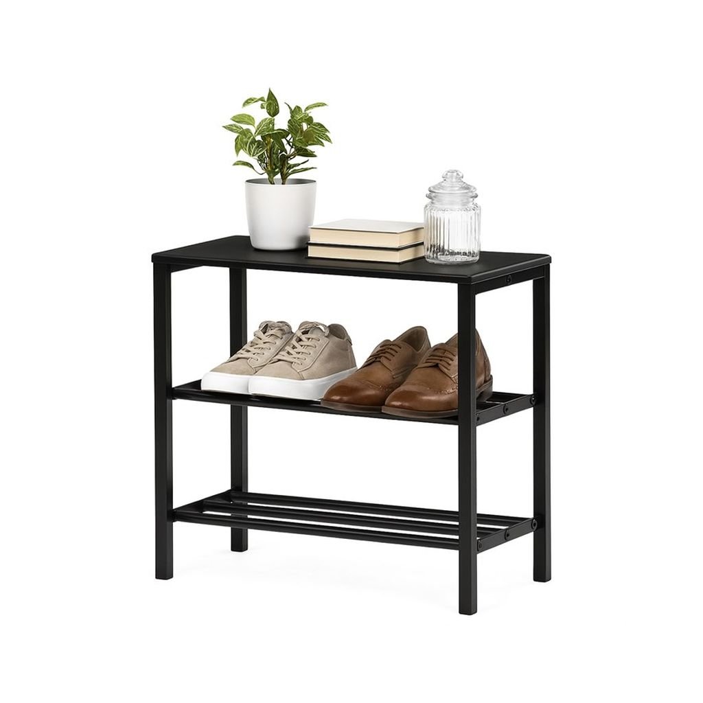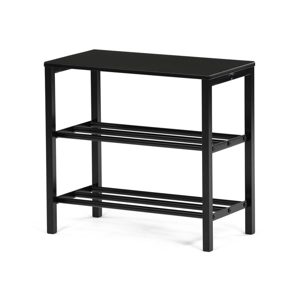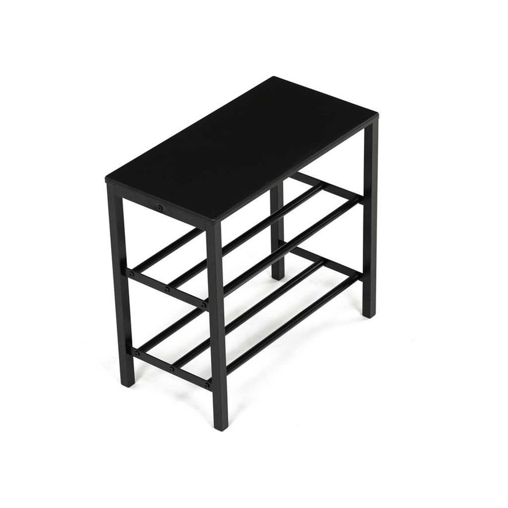 Štýlový čierny botník s kovovou konštrukciou ponúka dve priestranné police na obuv a hornú dosku na dekorácie. Minimalistický dizajn sa hodí do každého interiéru. Udržujte predsieň upratanú.