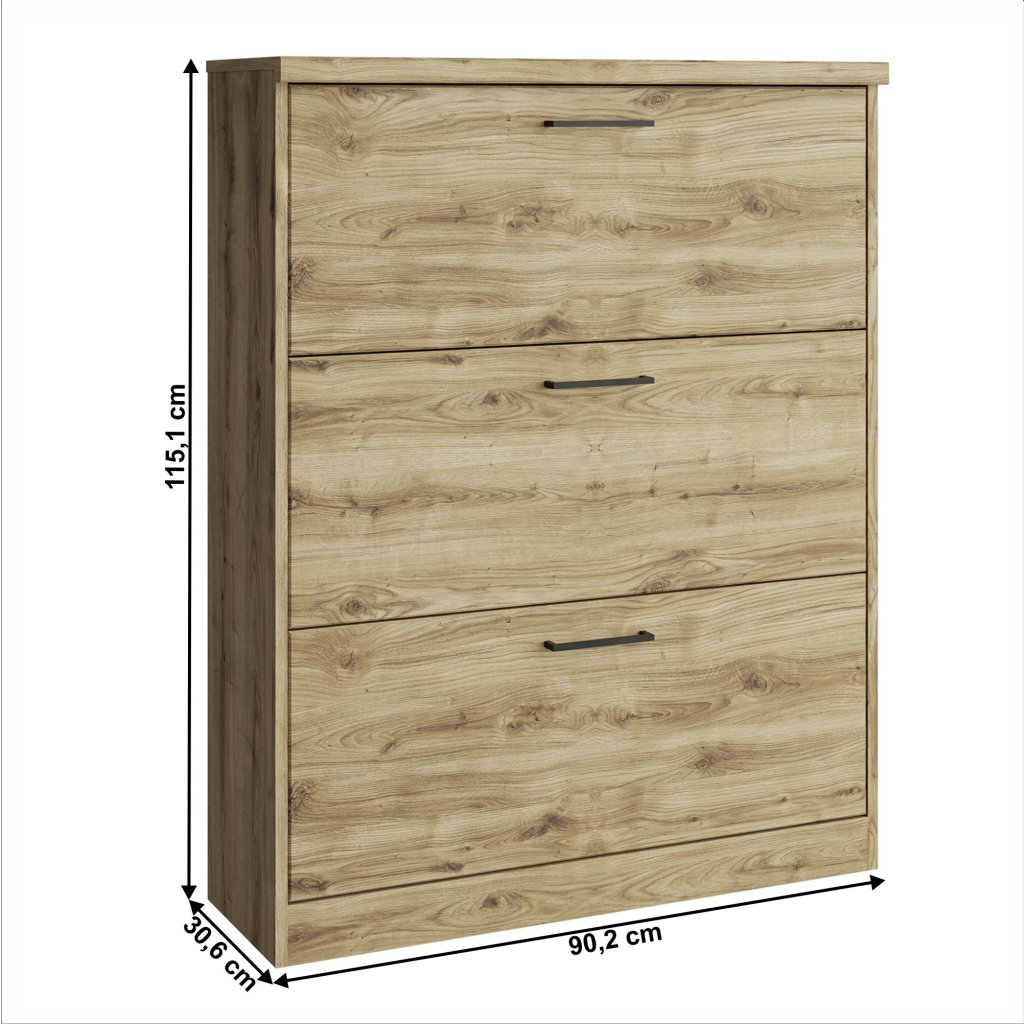 Vyrobený z kvalitného DTD laminovaného/MDF, botník je nielen štýlový, ale aj odolný. S tromi výklopnými úložnými priestormi a praktickými plastovými úchytkami v čiernej farbe, je tento botník dokonalou kombináciou funkčnosti a dizajnu.