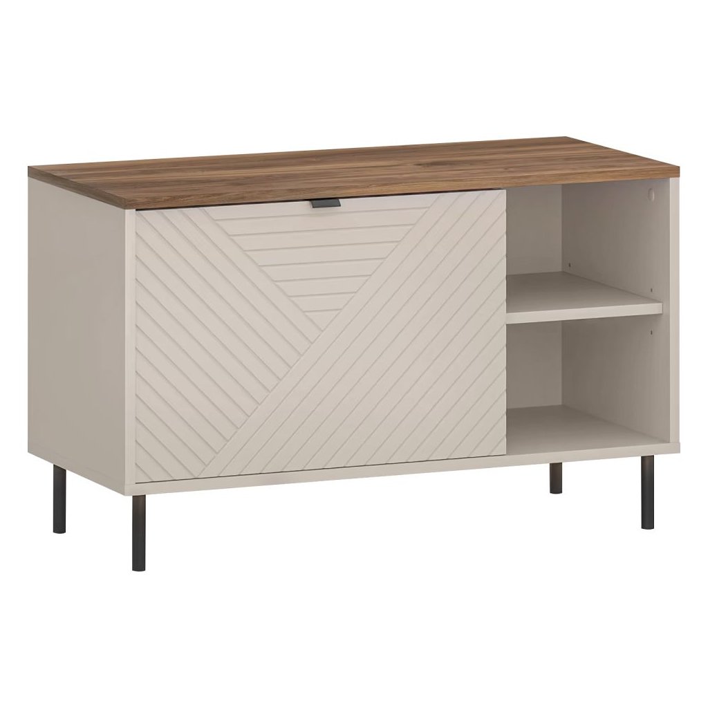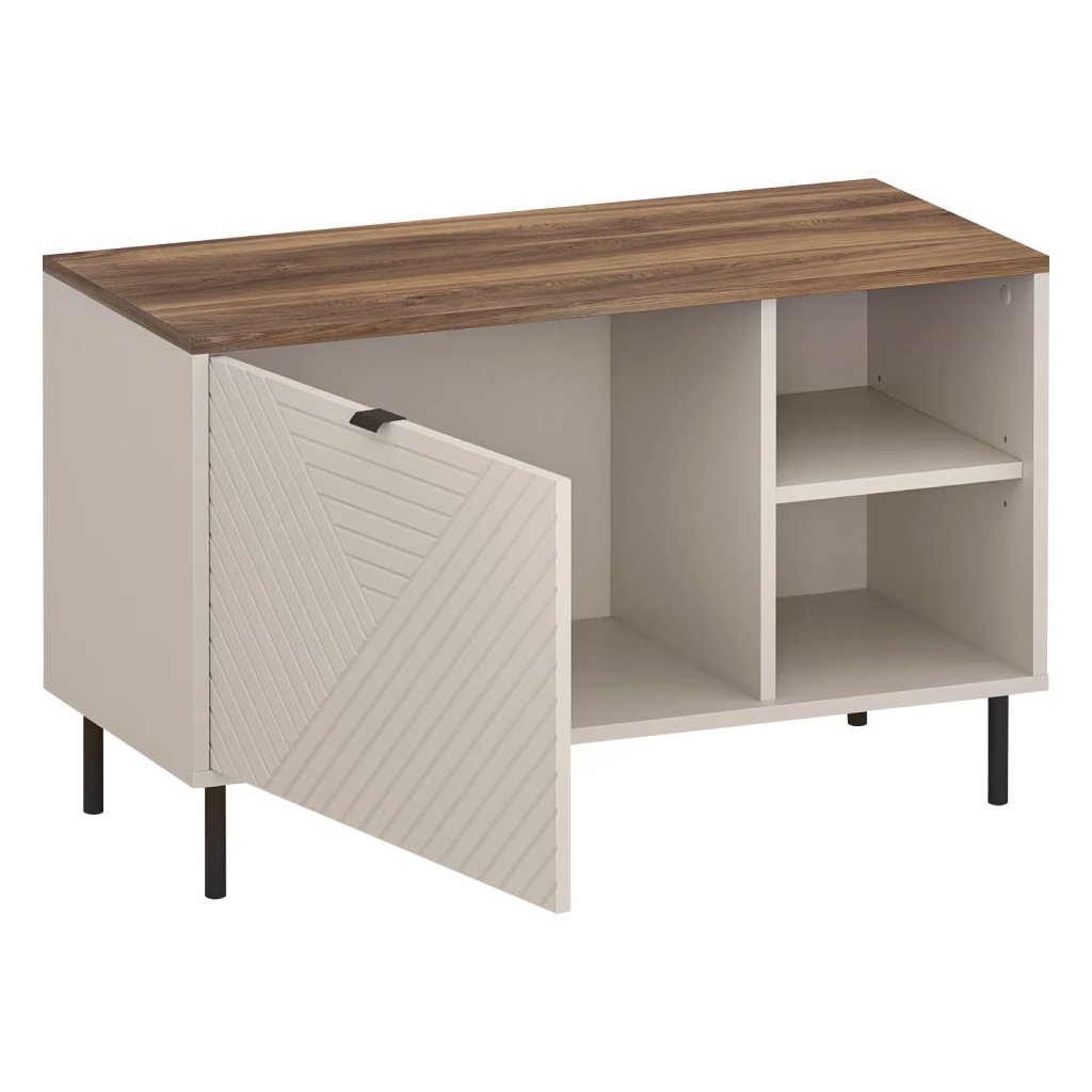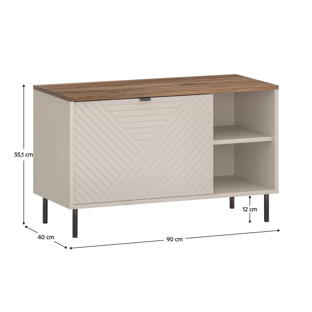 Botník v modernom dizajne v kombinácii farieb kašmír a dub castello. S rozmermi 90x40x55,1 cm ponúka jednu skrinku, otvorený úložný priestor a praktickú poličku. Na nožičkách s čiernymi kovovými úchyt