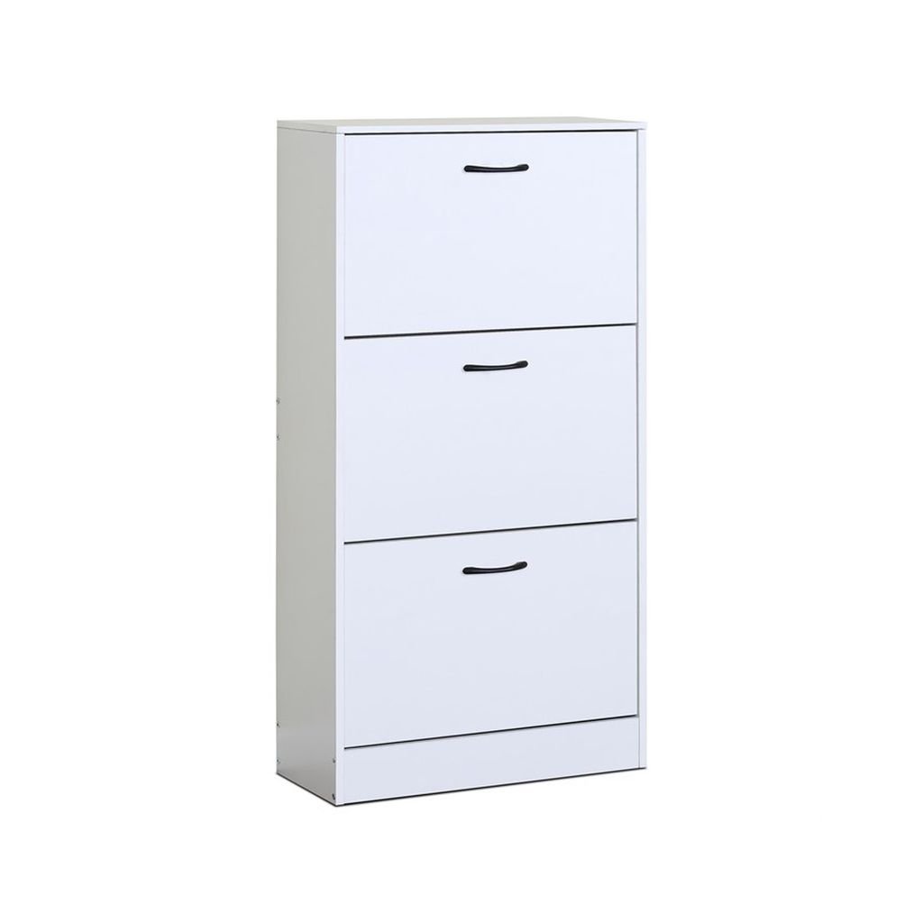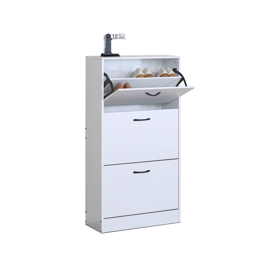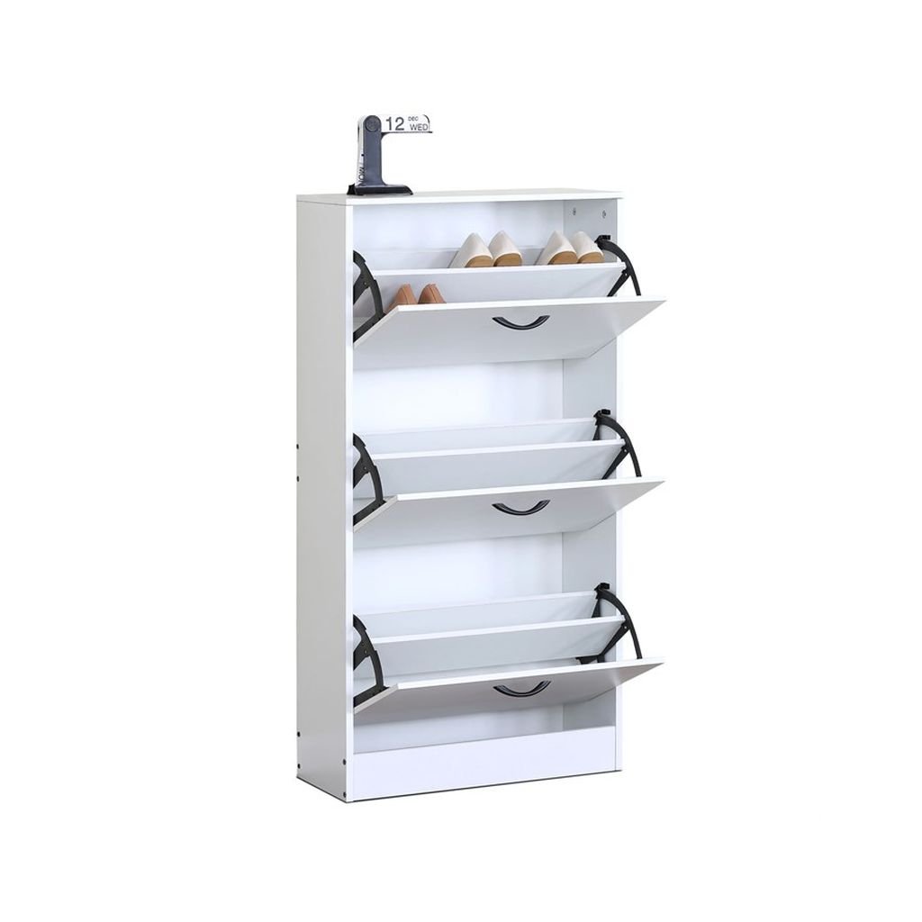 Jeho jednoduchý dizajn a hladký povrch zabezpečujú ľahkú údržbu a čistý vzhľad. S tromi praktickými priehradkami a čiernymi úchytkami na otváranie, botník umožňuje efektívnu organizáciu obuvi a udržiava váš priestor prehľadný a uprataný.