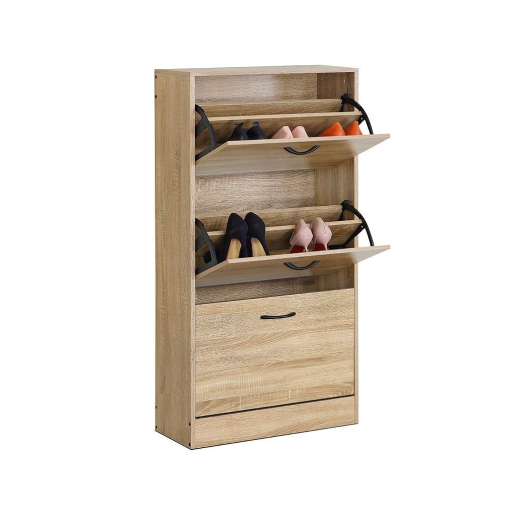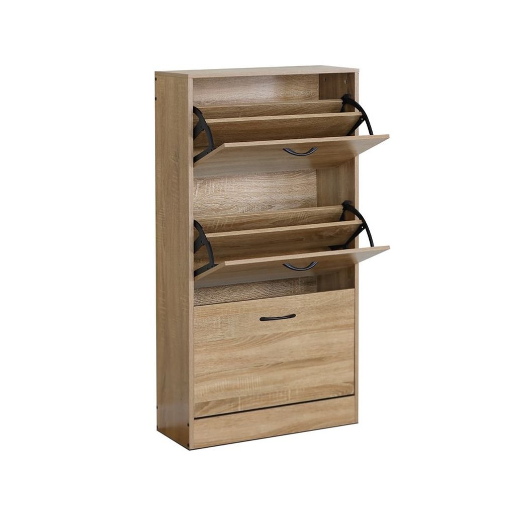 Botník s tromi priehradkami v dekore dub je praktickým riešením na uskladnenie obuvi. Vyrobený z MDF dosiek, s čiernymi kovovými úchytkami a kompaktnými rozmermi, skvele zapadne do menších priestorov.