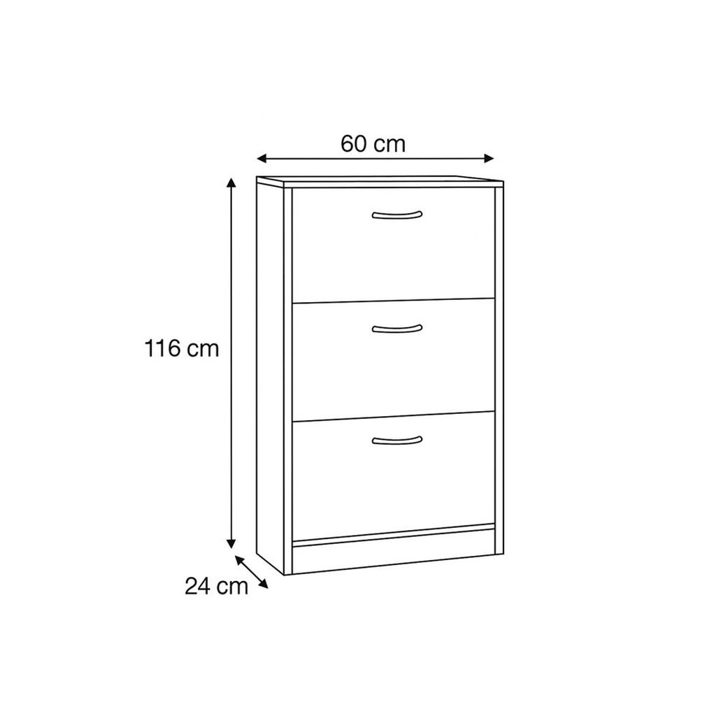Vyrobený z kvalitných MDF dosiek, botník napodobňuje prirodzenú štruktúru dreva, čo mu dodáva elegantný vzhľad. S tromi praktickými priehradkami a čiernymi kovovými úchytkami, ktoré zabezpečujú jednoduché otváranie, je tento botník nielen esteticky príťažlivý, ale aj mimoriadne funkčný.