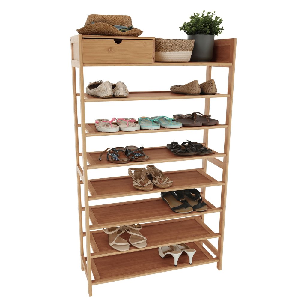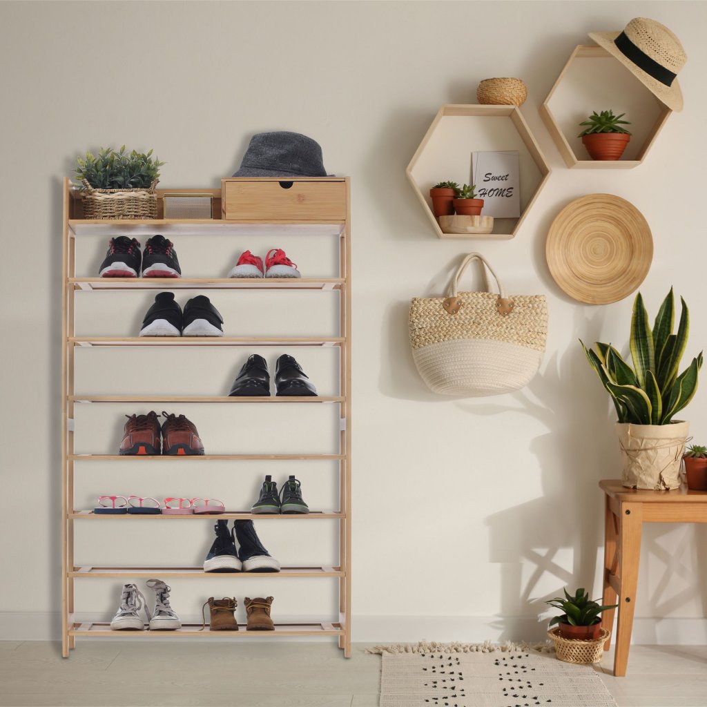 Praktický 7-radový botník z lakovaného bambusu s rozmermi 70x25x117 cm. Otvorené police a zásuvka pre efektívnu organizáciu topánok. Prírodný dizajn, jednoduchá montáž a údržba. Nosnosť 50 kg. Dodávan