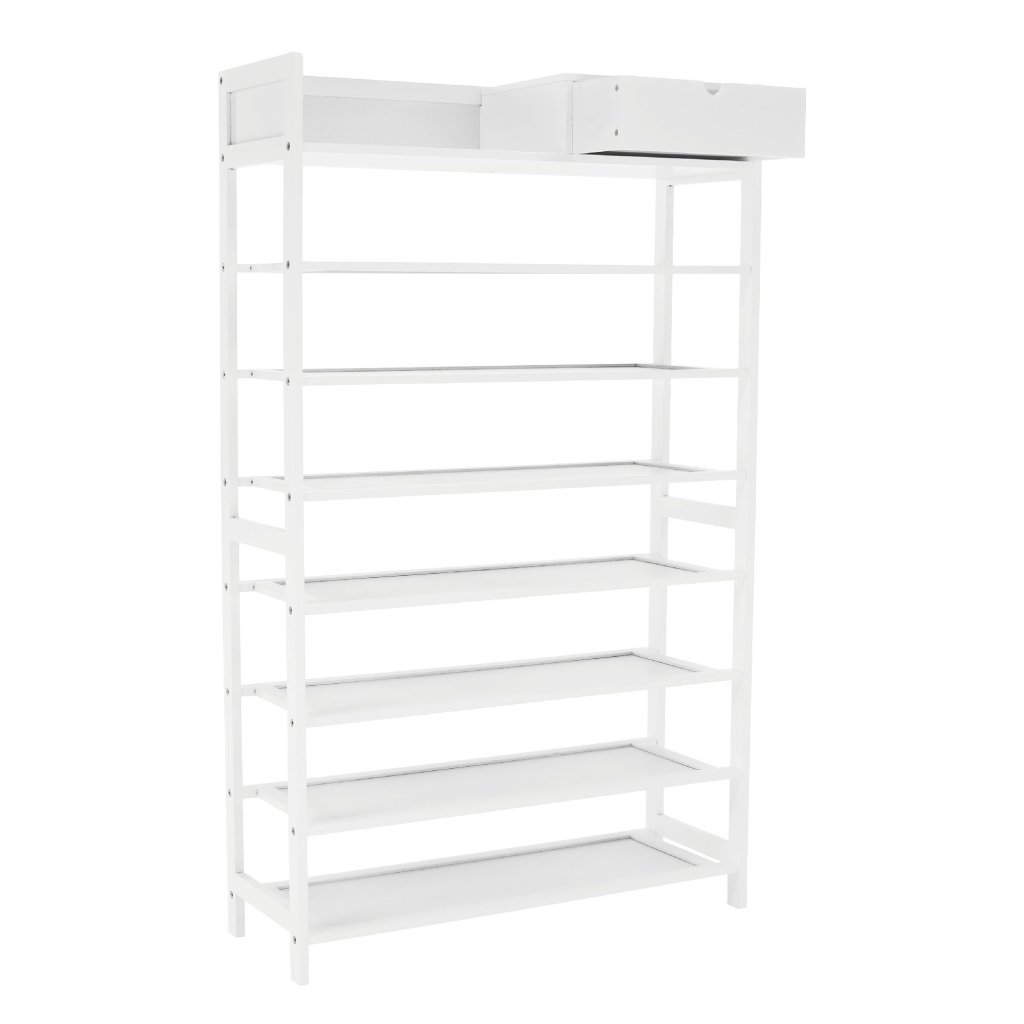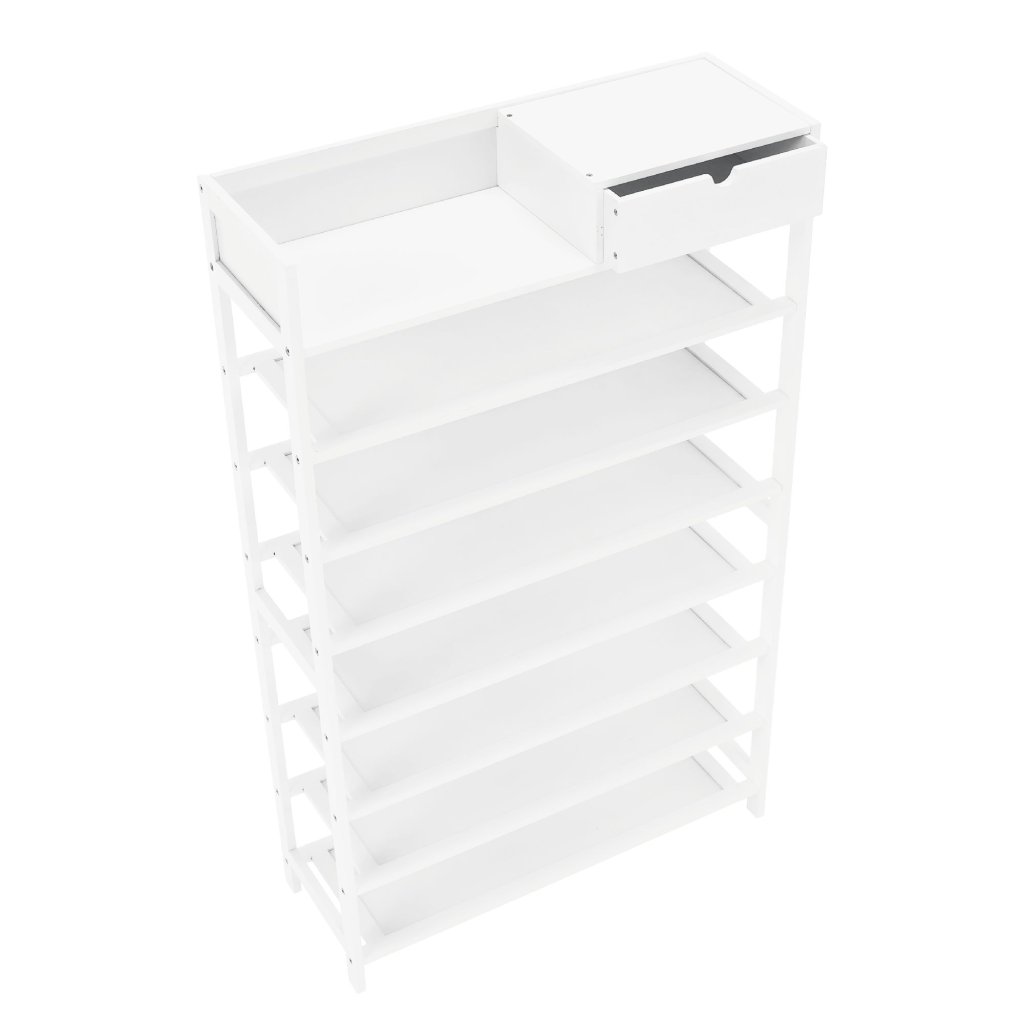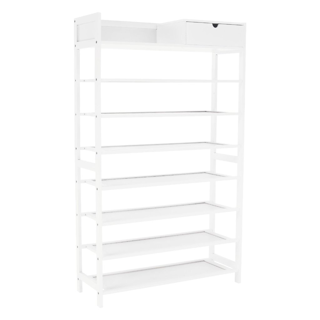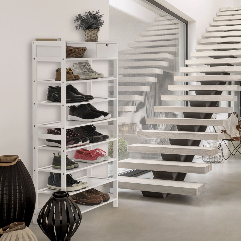 Biely botník z lakovaného bambusu ponúka praktické riešenie pre organizáciu topánok. S rozmermi 70x25x117 cm a 7 radmi políc, vrátane zásuvky, je ideálny do predsiene. Jednoduchá montáž a údržba. Nosn