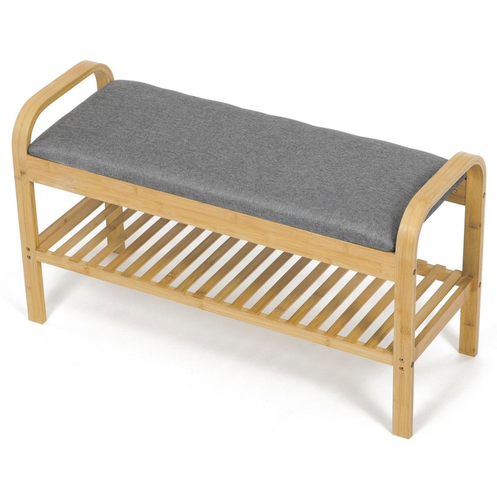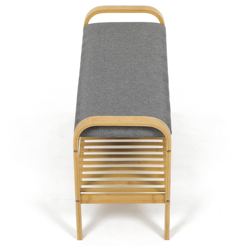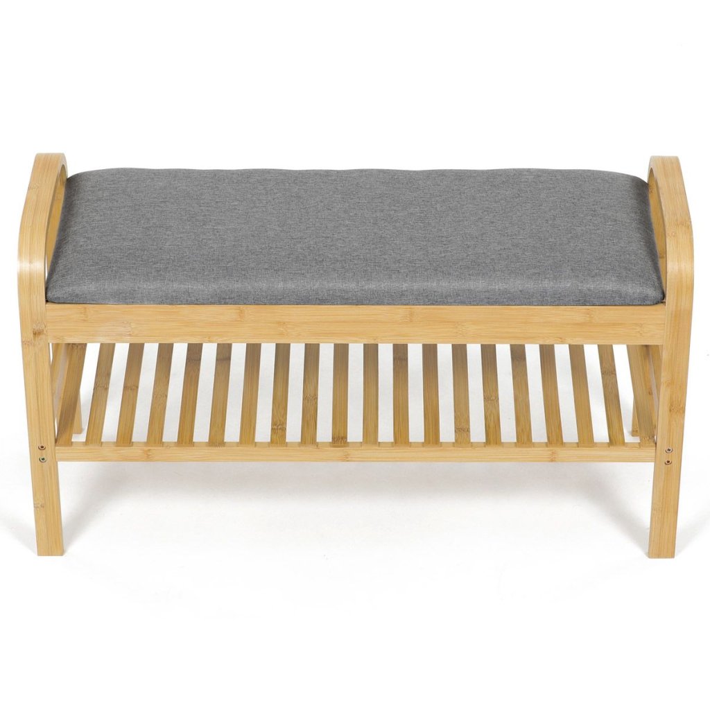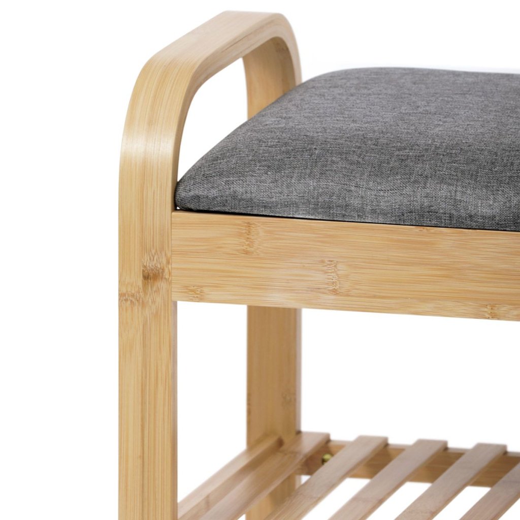Štýlový botník s čalúneným sivým sedadlom a kvalitným bambusovým rámom. Kombinuje praktické úložisko na topánky s pohodlným sedením, ideálny pre každý interiér.
