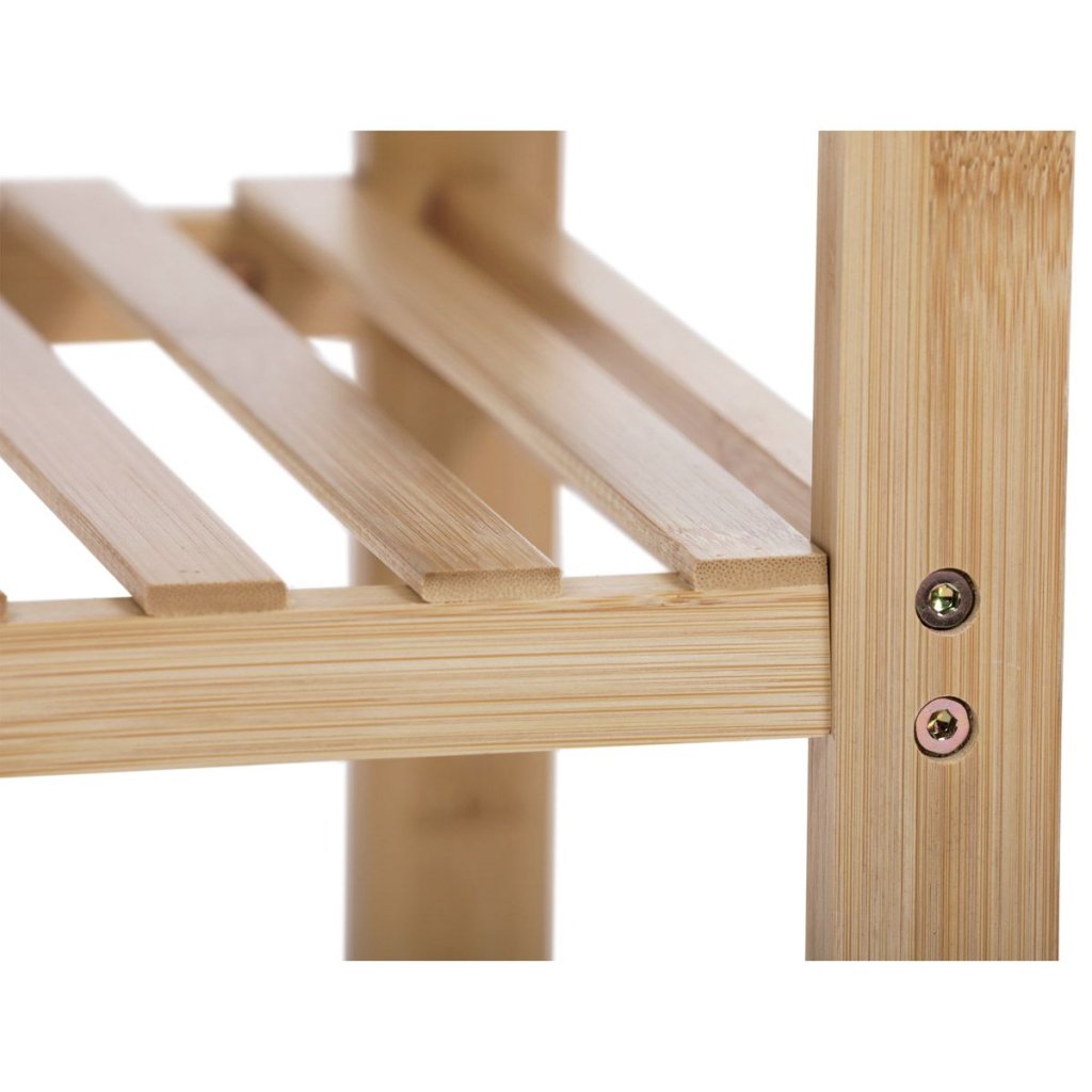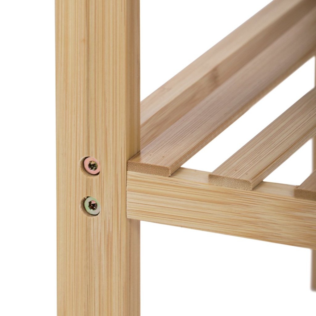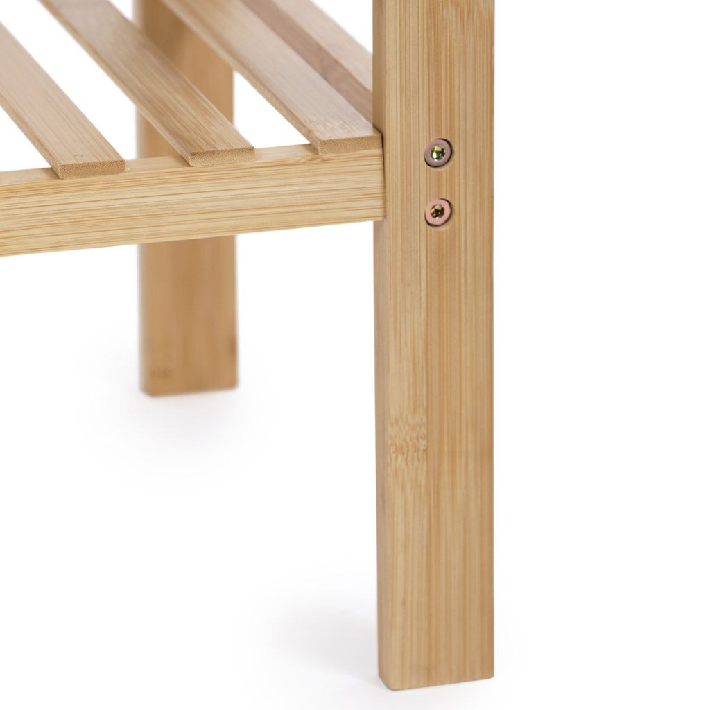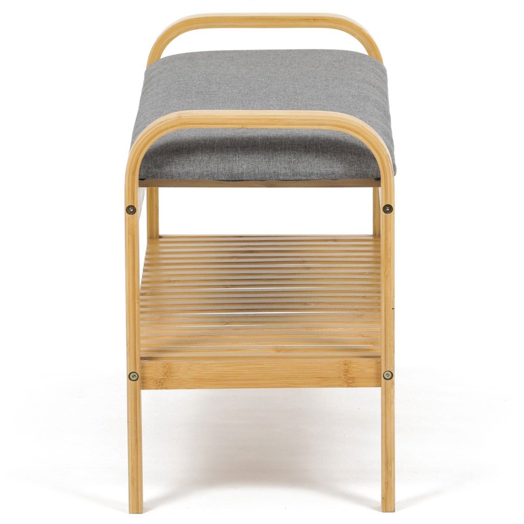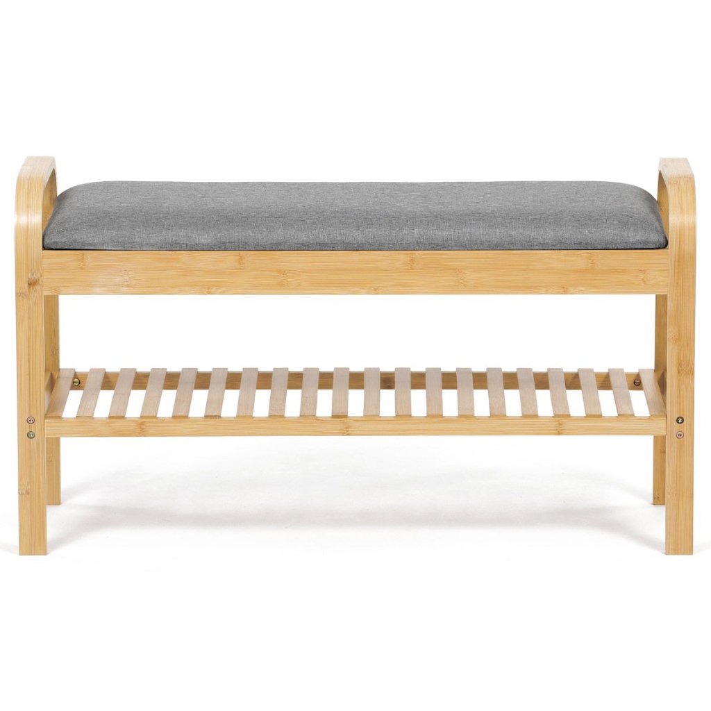Štýlový botník s čalúneným sivým sedadlom a kvalitným bambusovým rámom. Kombinuje praktické úložisko na topánky s pohodlným sedením, ideálny pre každý interiér.