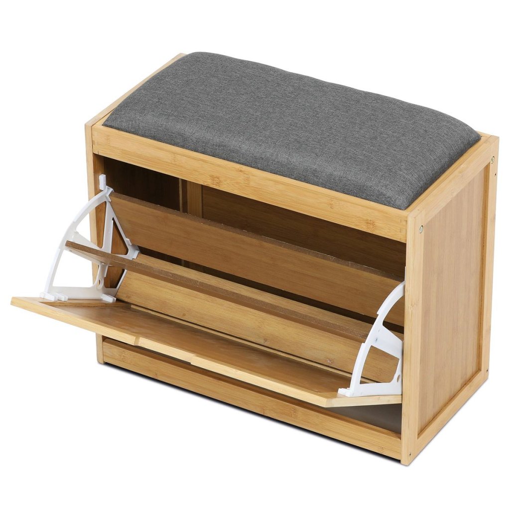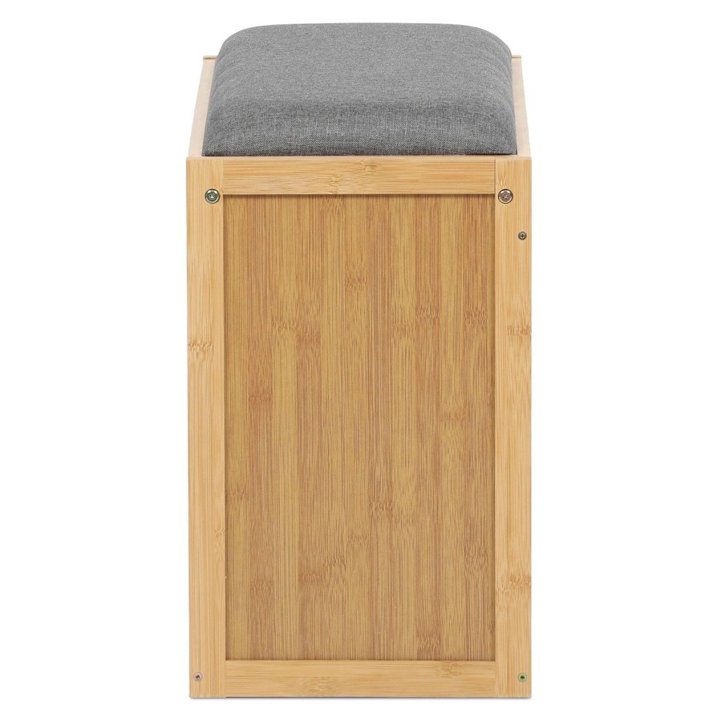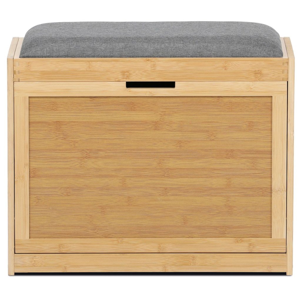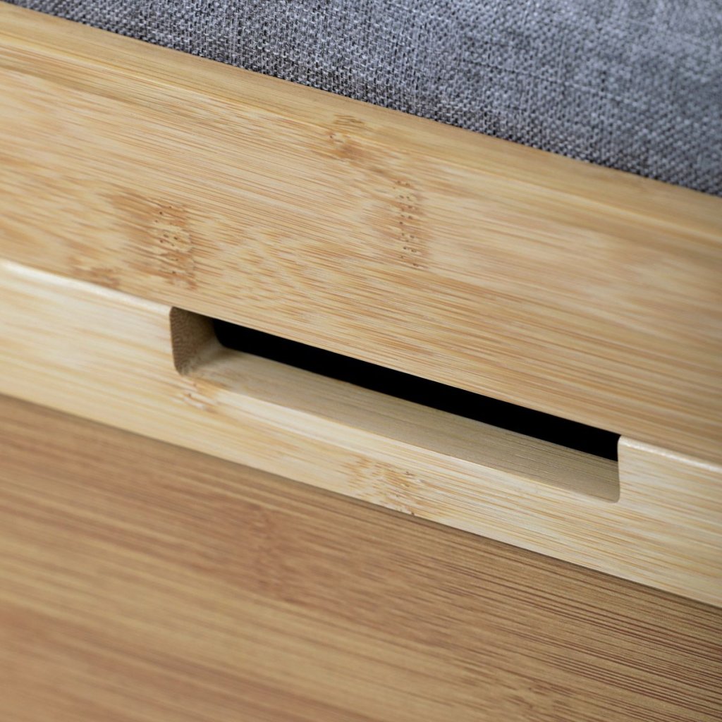 Botník KOMKI v sivej farbe kombinuje prírodný bambus s pohodlným sedákom z kvalitnej textílie. S výklopným vekom ponúka praktický úložný priestor a skvele sa hodí do menších predsiení.