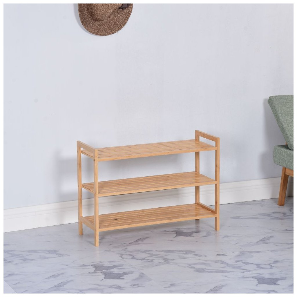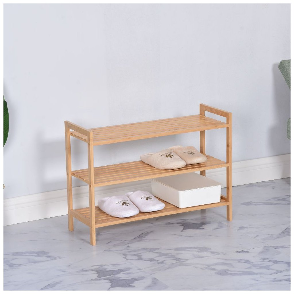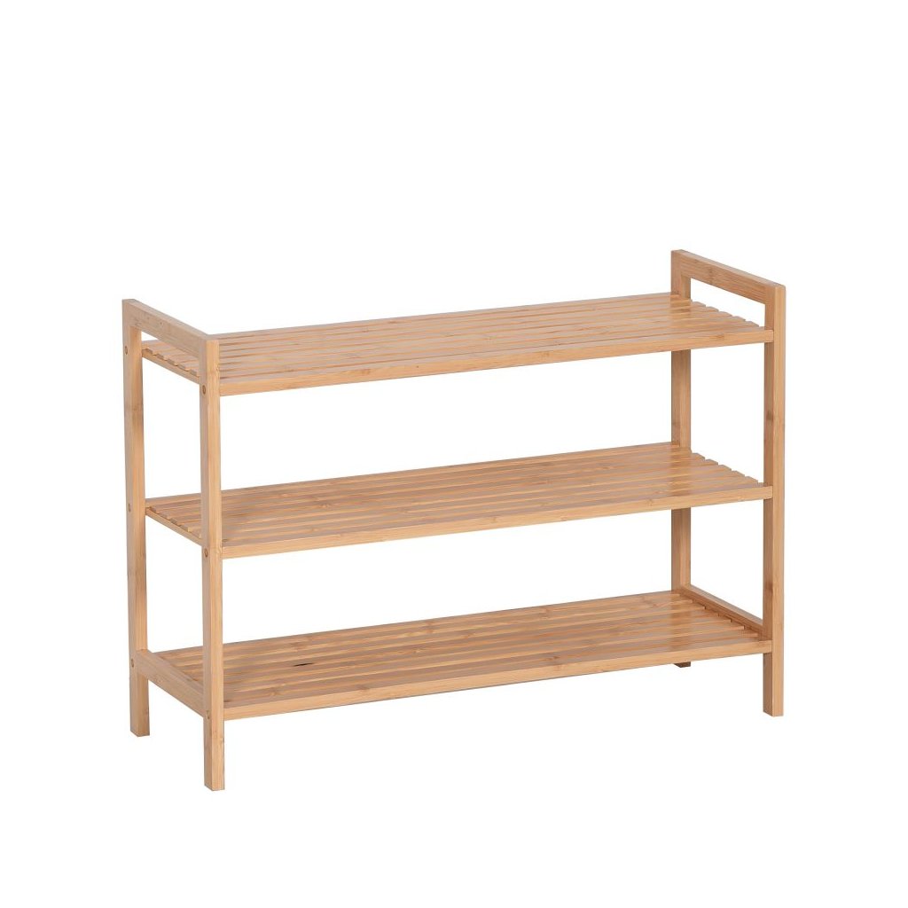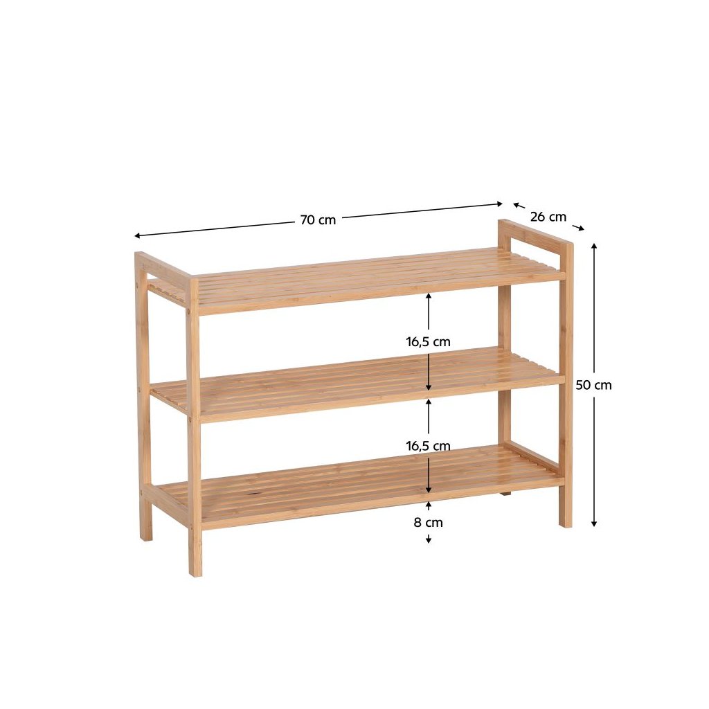 Botník z lakovaného bambusu s prírodným dizajnom. Rozmery 70x26x50 cm, 3 police s výškou medzi nimi 16,5 cm. Otvorený úložný priestor, jednoduchá montáž a praktické využitie. Dodáva sa v demonte.