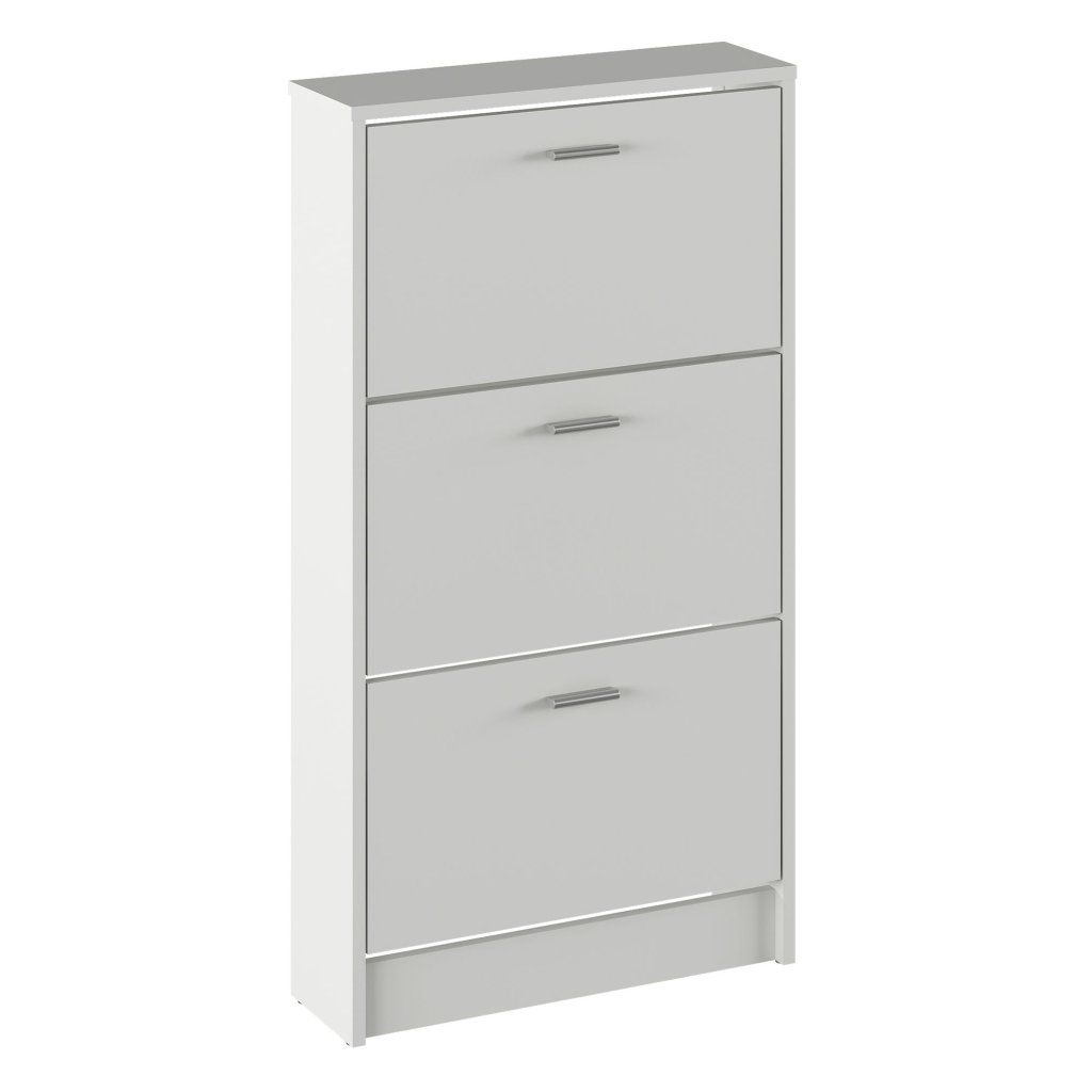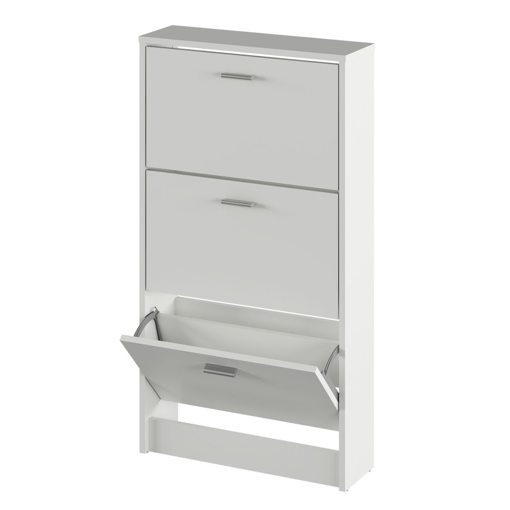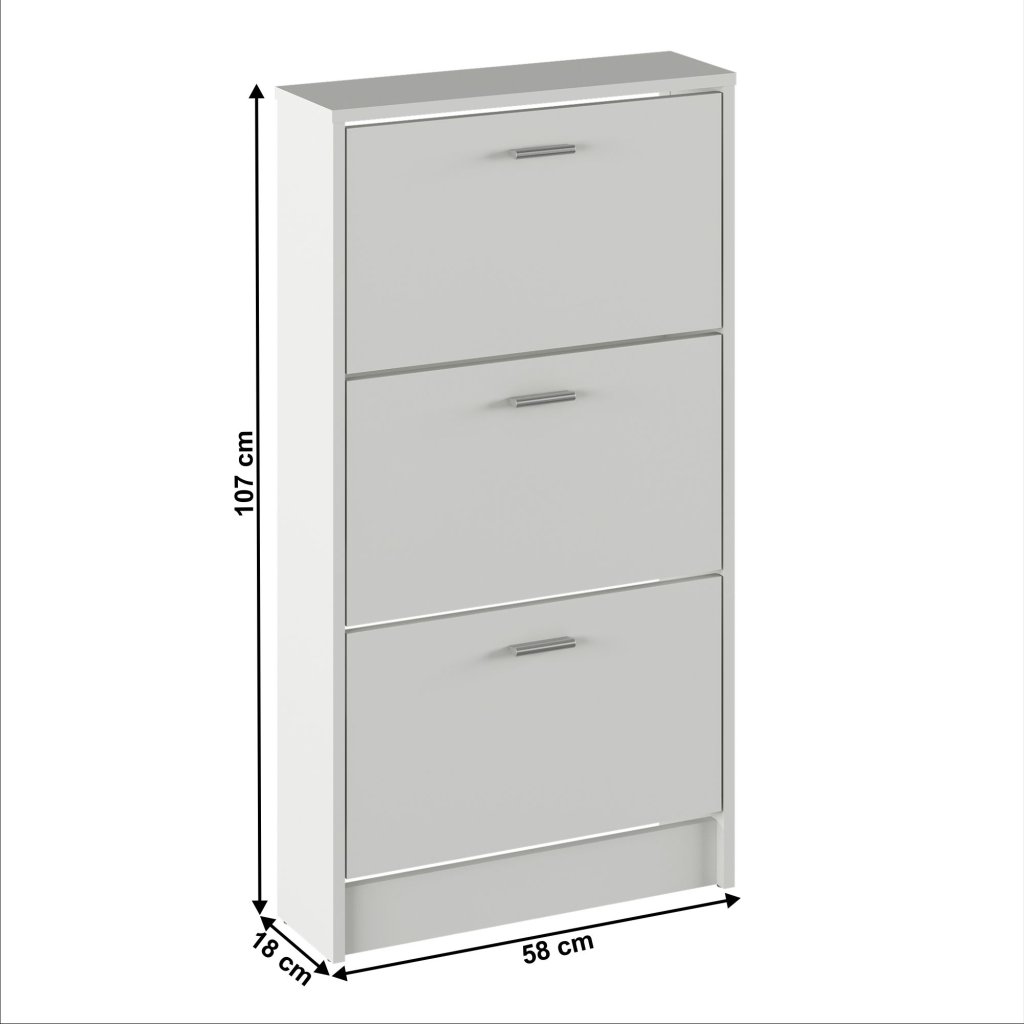 Praktický 3-radový botník v bielej farbe s výklopnými šuplíkmi. Vyrobený z laminovanej DTD, rozmery 58x18x107 cm. Dodávaný v demonte, ideálny pre úsporu priestoru.