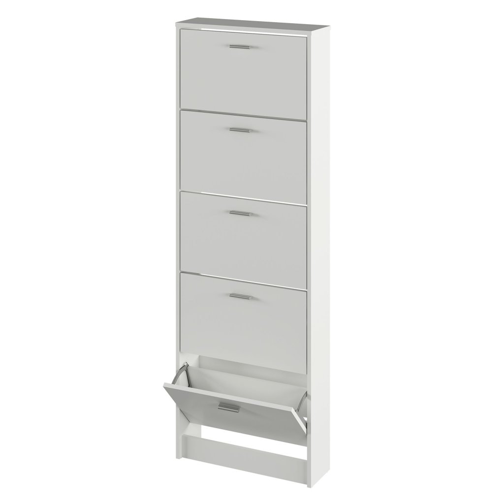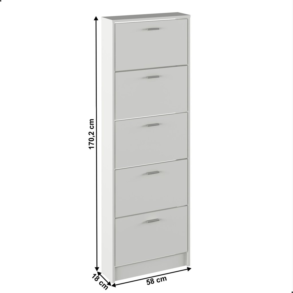 Biely botník MOBI 5 ponúka praktické 5-radové uloženie obuvi s výklopnými šuplíkmi. Rozmery 58x18x170,2 cm a moderný dizajn skvele zapadnú do každého interiéru. Dodávaný v demonte.