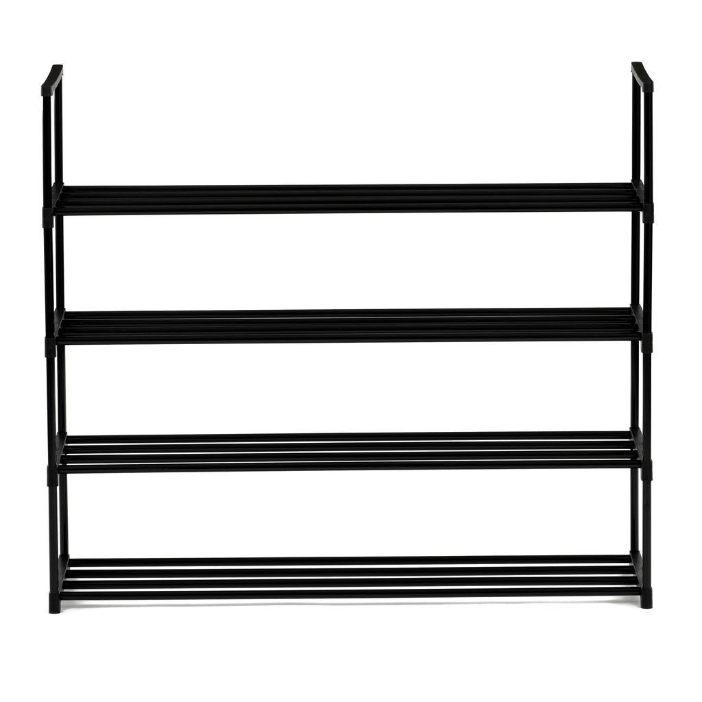 Priestranný čierny botník s kovovou konštrukciou a štyrmi policami ponúka elegantné a praktické riešenie na uskladnenie obuvi. Stabilný a ľahko premiestniteľný, ideálny do predsiene či šatne.
