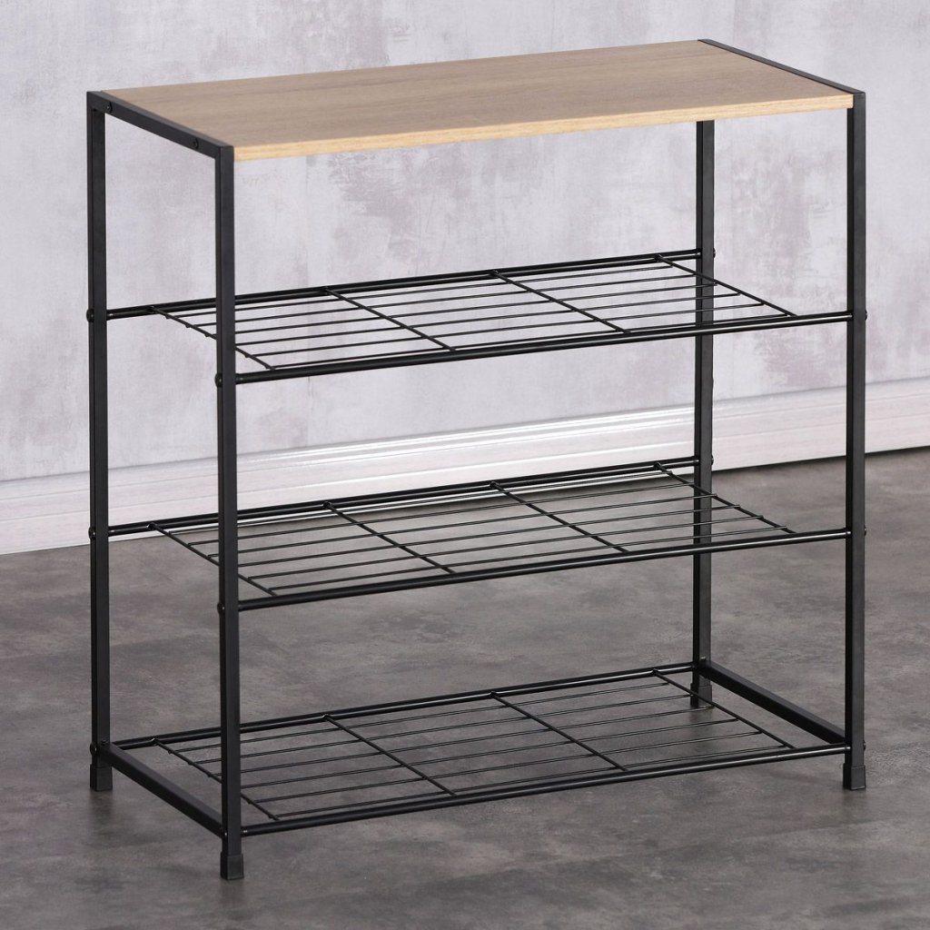Hnedý botník s kovovou konštrukciou a odkladacími plochami. Pôda z MDF dosky s povrchovou úpravou 3D fólie v odtieni dub sonoma. Ideálny na organizáciu obuvi.