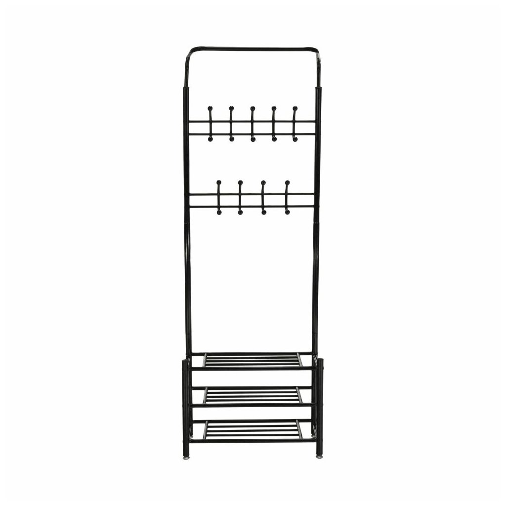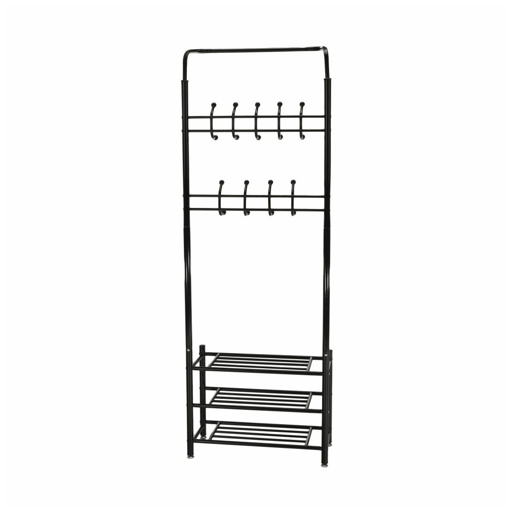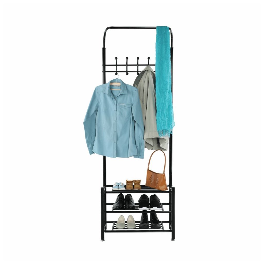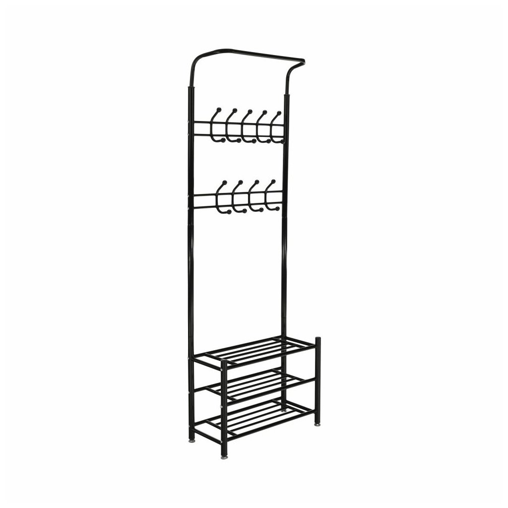 Čierny botník s vešiakom z kovu ponúka praktické riešenie na uskladnenie obuvi a kabátov. Rozmery 66x30x190 cm, s háčikmi a kovovými policami, dodávaný v demonte.