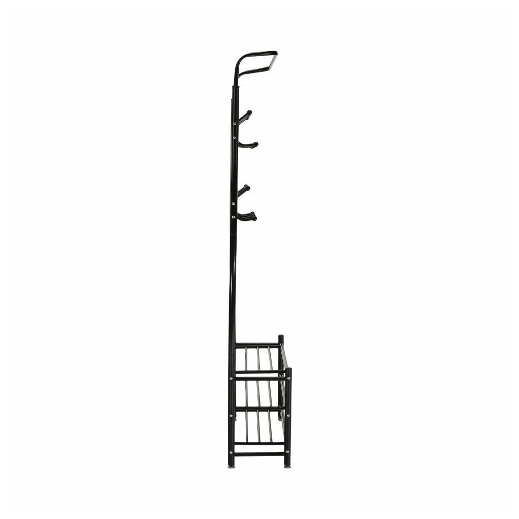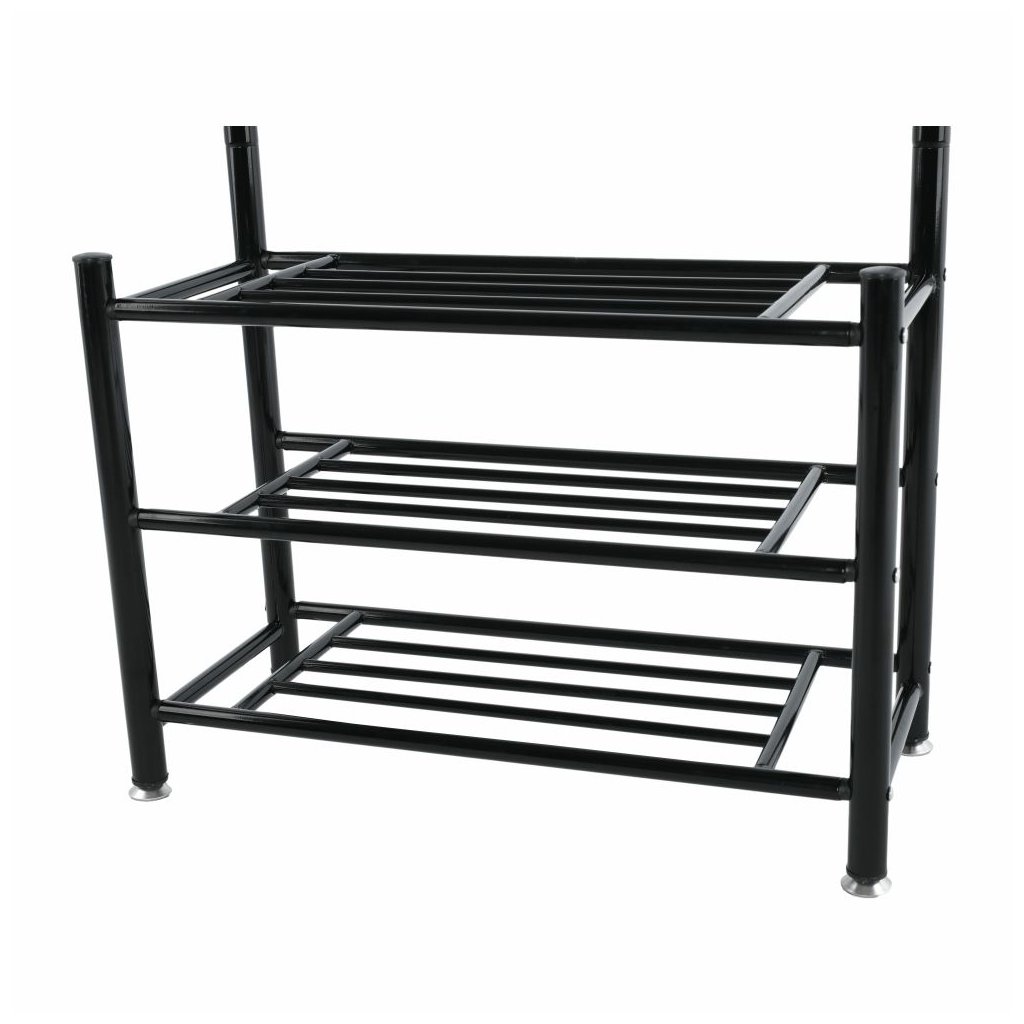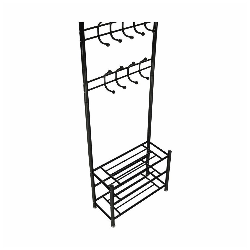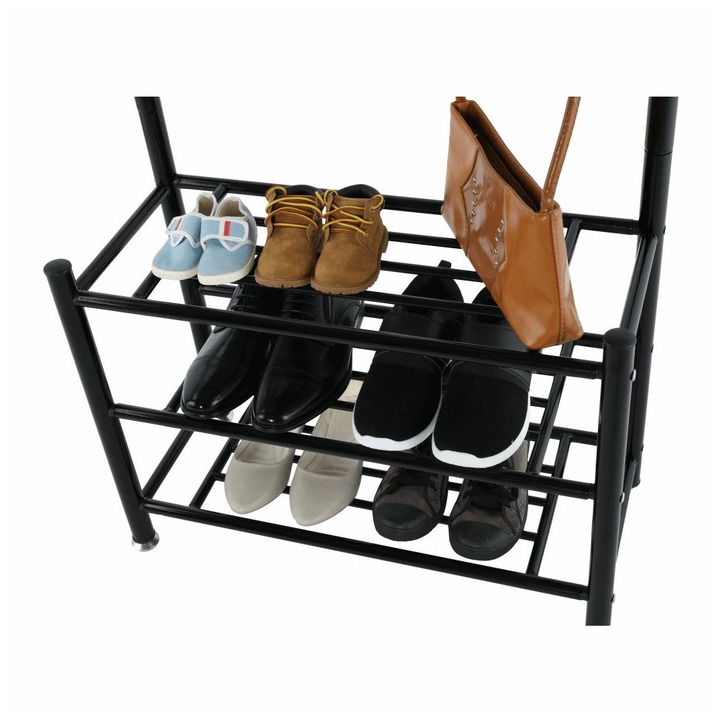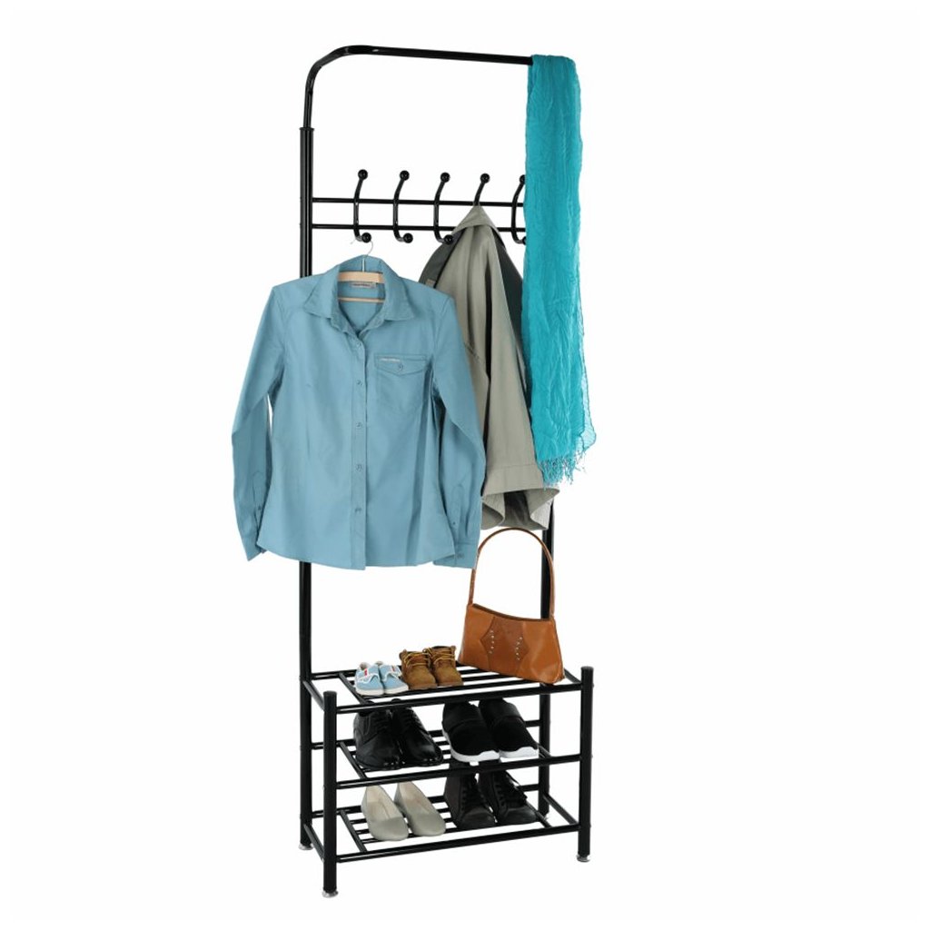 Čierny botník s vešiakom z kovu ponúka praktické riešenie na uskladnenie obuvi a kabátov. Rozmery 66x30x190 cm, s háčikmi a kovovými policami, dodávaný v demonte.