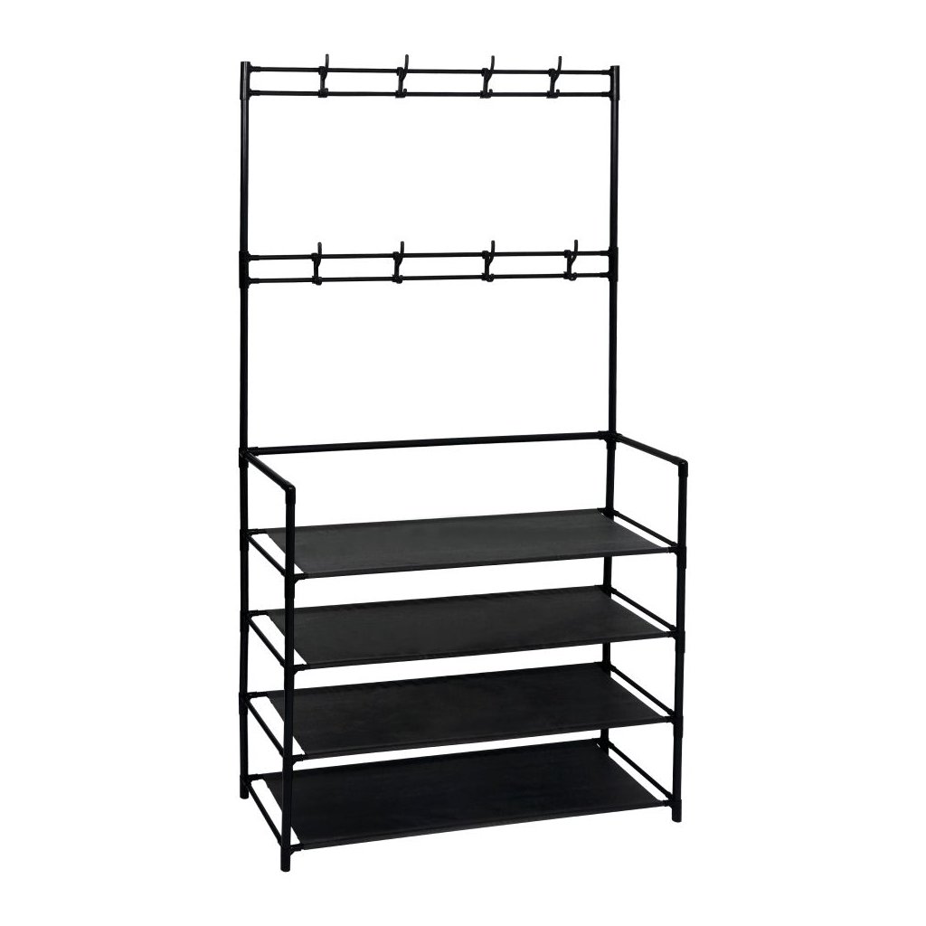 Vďaka robustnej konštrukcii z kovu, plastu a látky ponúka tento botník vysokú stabilitu a odolnosť. S ôsmimi háčikmi a štyrmi policami poskytuje dostatok miesta na váš oblečenie a obuv, čím uľahčuje každodenné používanie a udržiavanie poriadku.