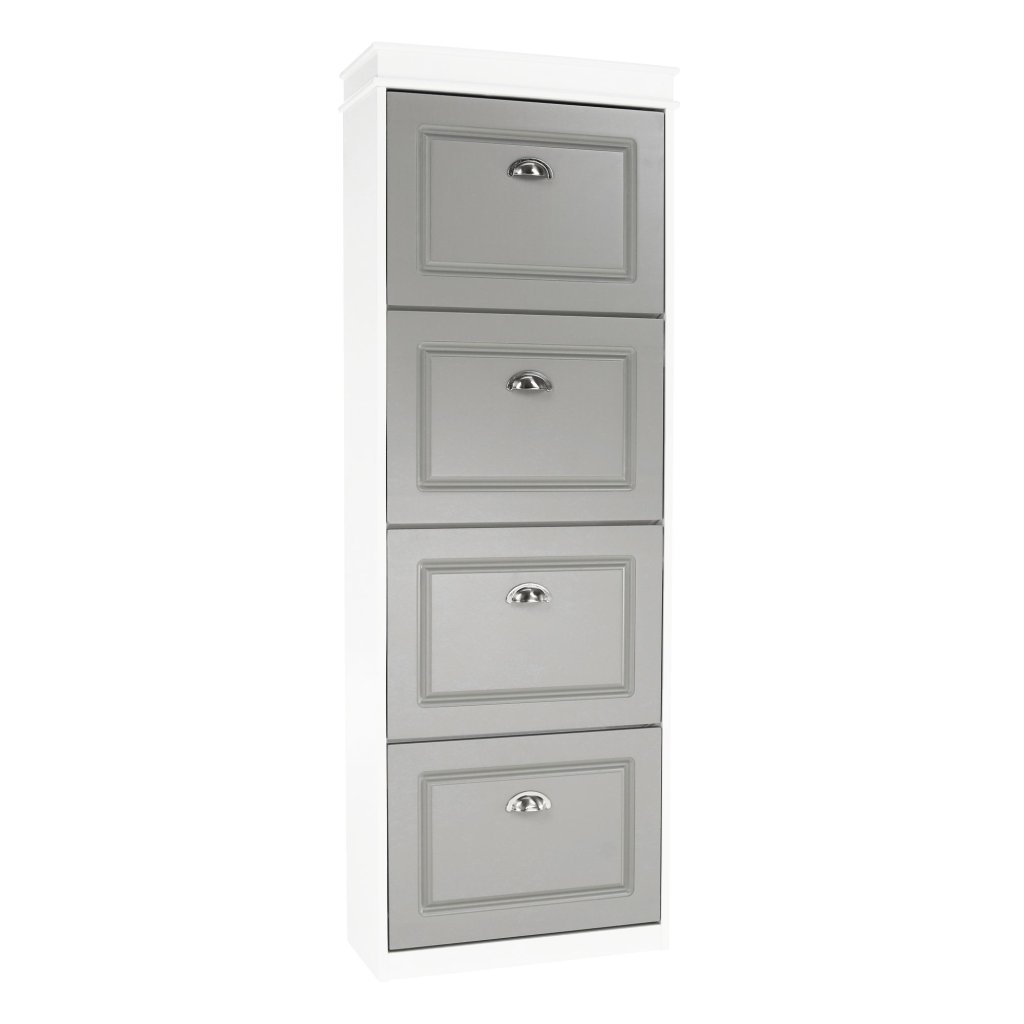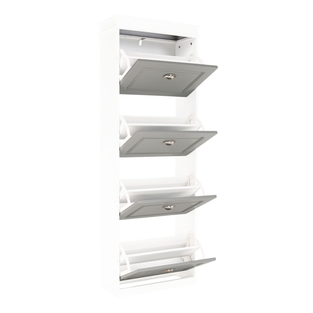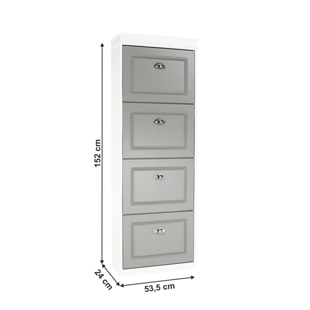 Praktický botník v bielo-sivej kombinácii ponúka 4 radový úložný priestor na 16 párov topánok. S výklopnými šuplíkmi a úchytkami, rozmermi 53,5x24x152 cm a nosnosťou 90 kg. Dodávané v demonte.
