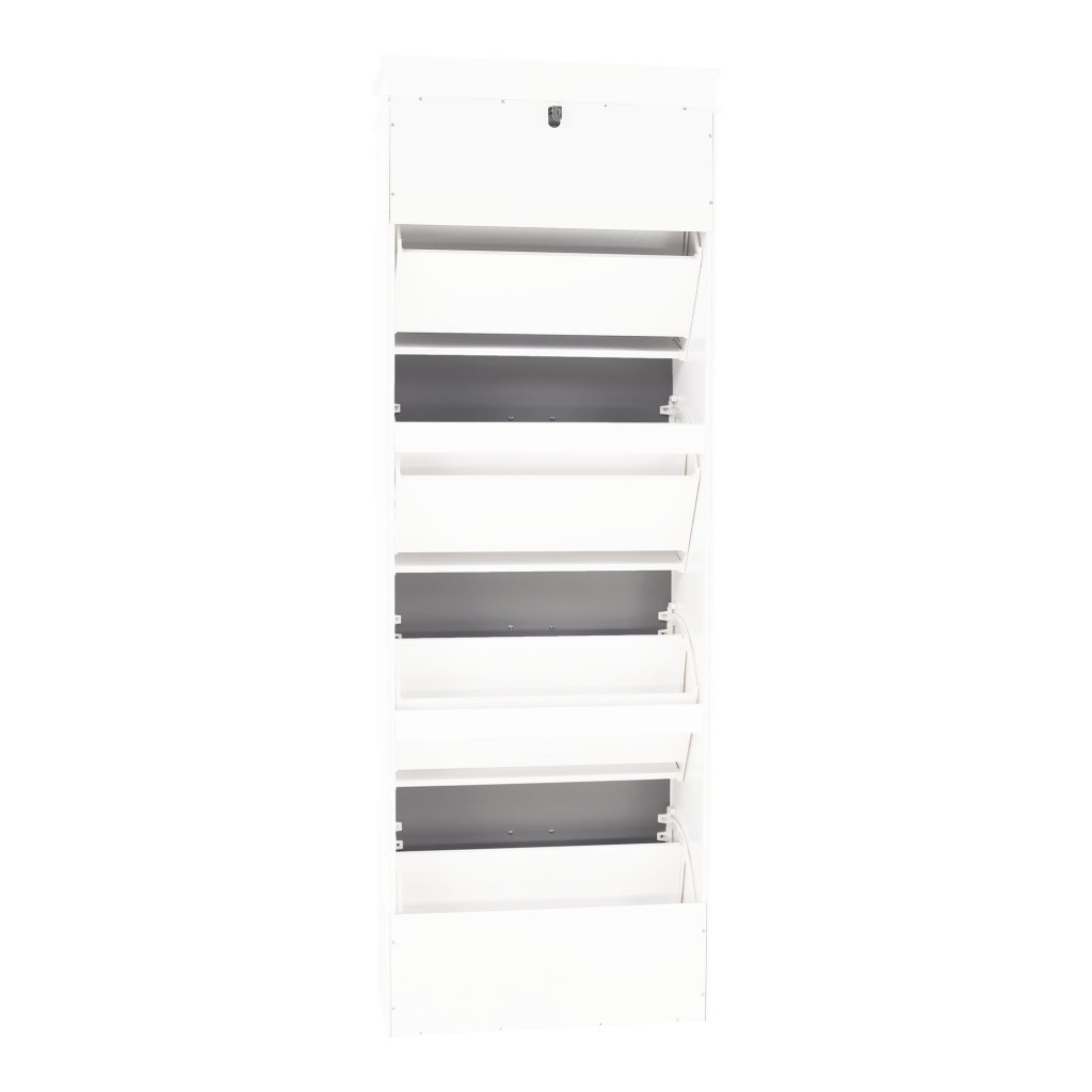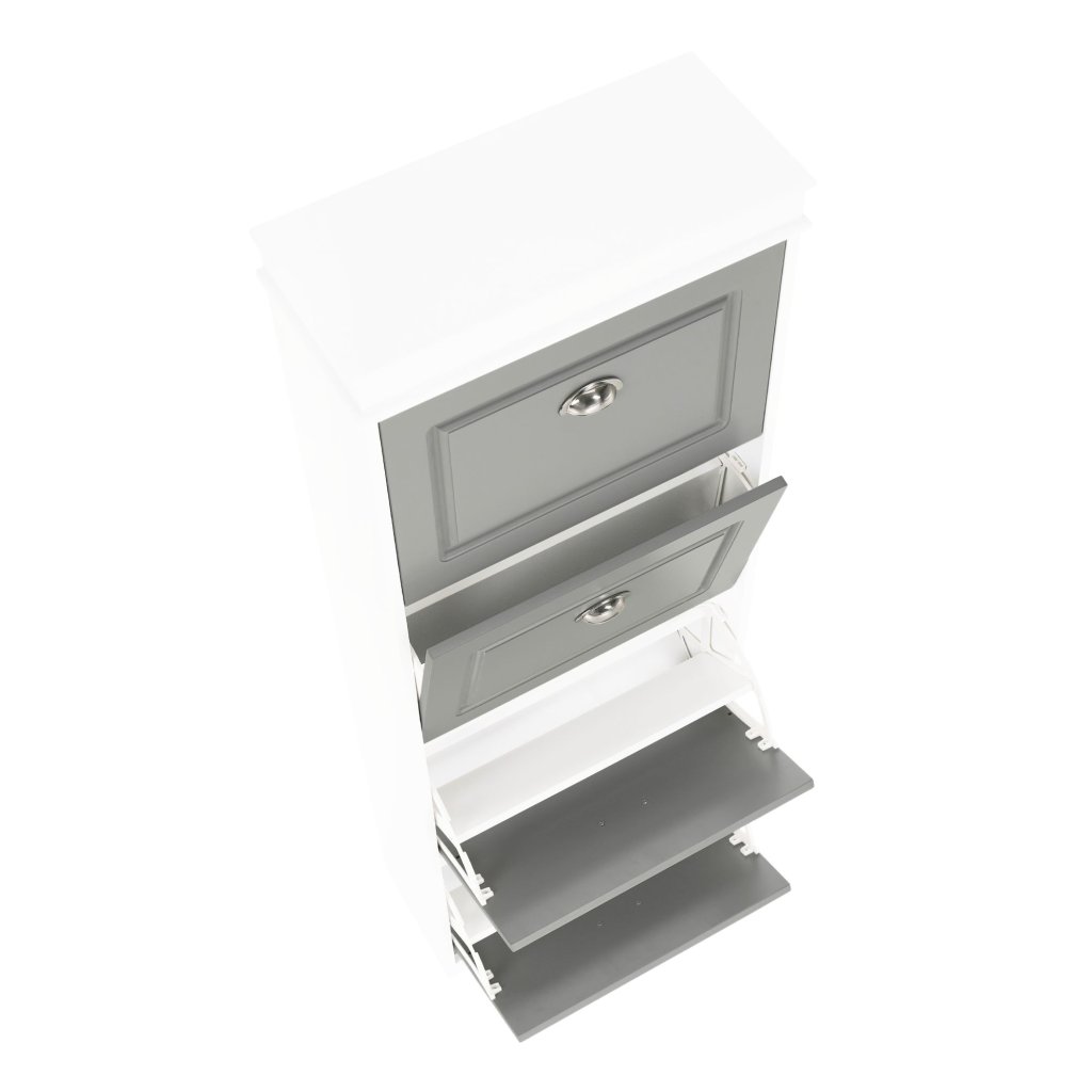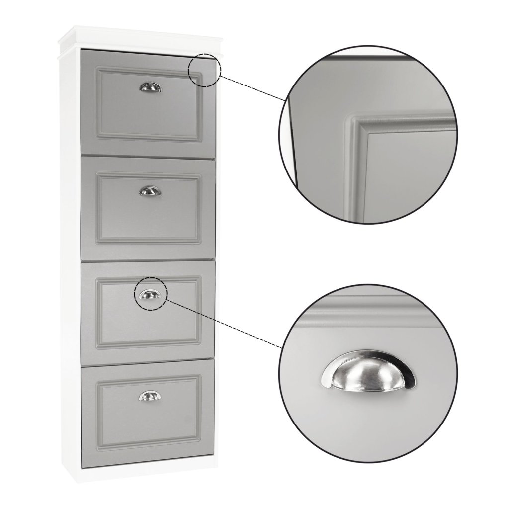 Praktický botník v bielo-sivej kombinácii ponúka 4 radový úložný priestor na 16 párov topánok. S výklopnými šuplíkmi a úchytkami, rozmermi 53,5x24x152 cm a nosnosťou 90 kg. Dodávané v demonte.