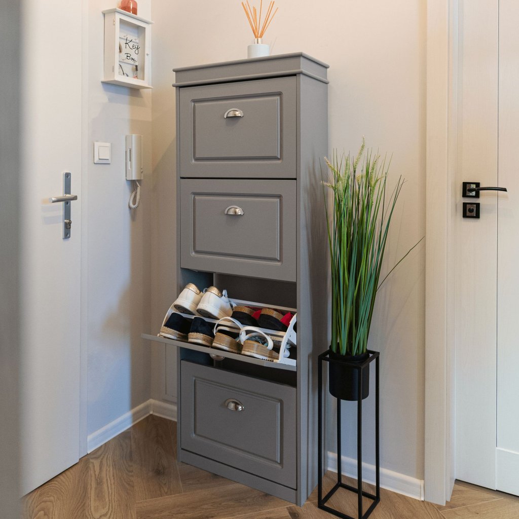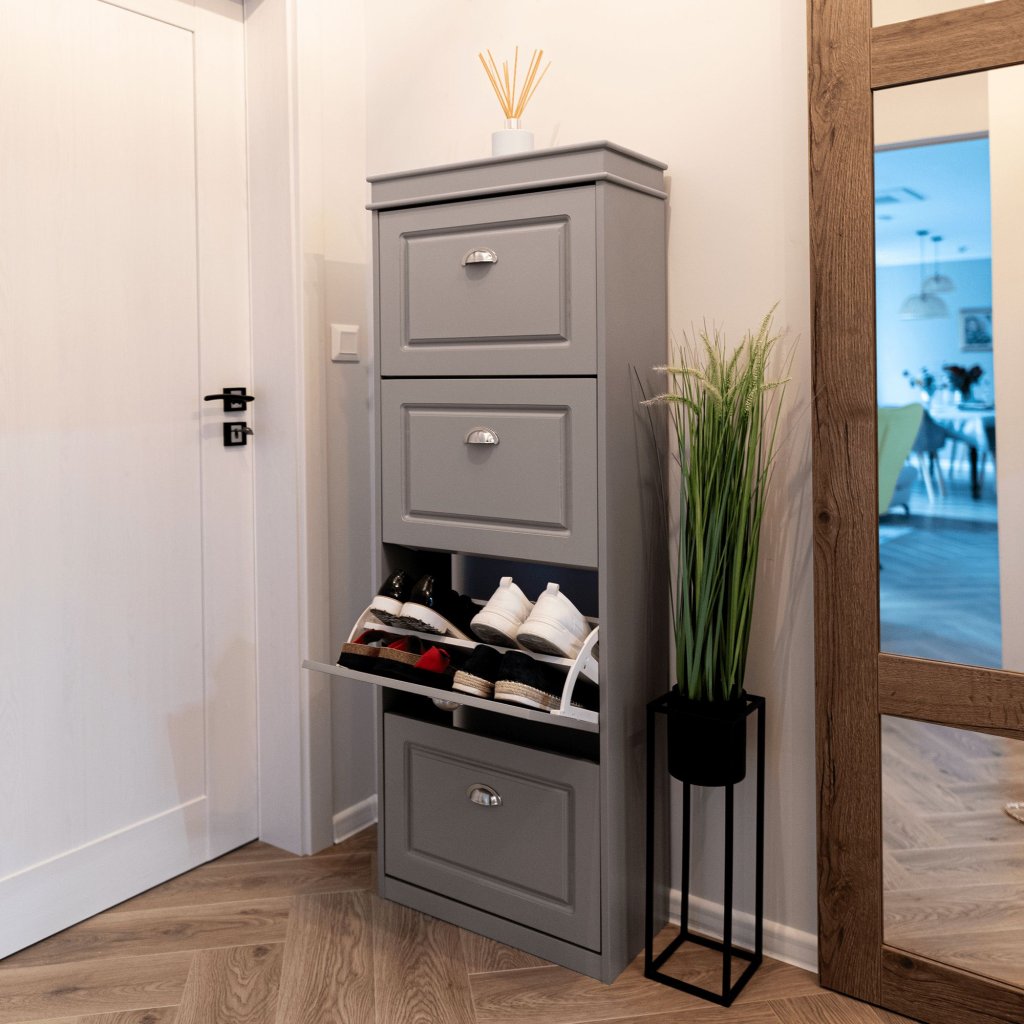 Botník SEBER 3 v elegantnej sivej farbe je ideálnym riešením pre organizáciu vašich topánok. S jeho moderným dizajnom a praktickými funkciami sa stane skvelým doplnkom do vašej predsiene alebo chodby. Umožňuje efektívne uskladnenie až 16 párov topánok a poskytuje dostatok priestoru pre všetky vaše obľúbené modely.