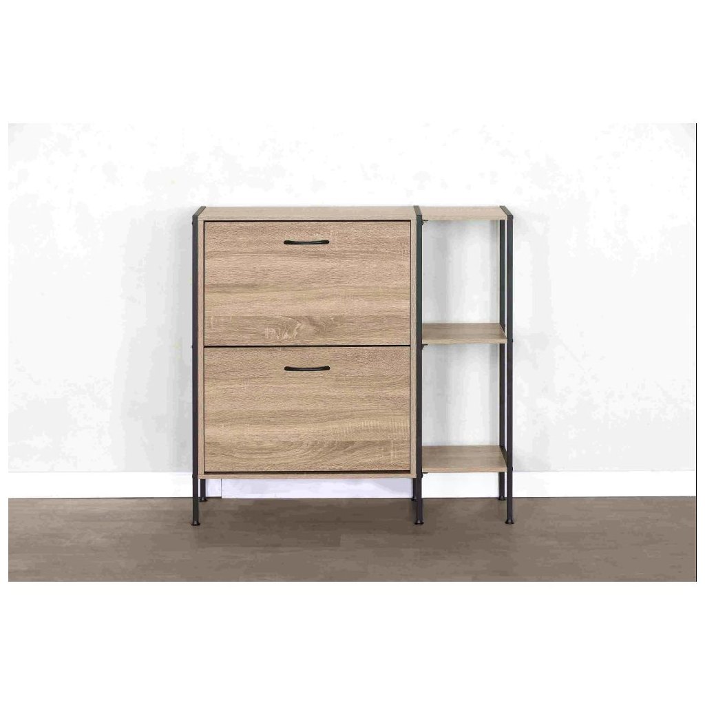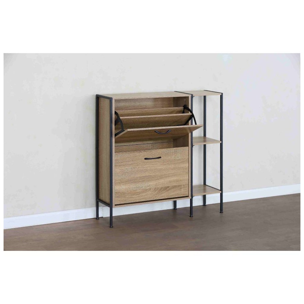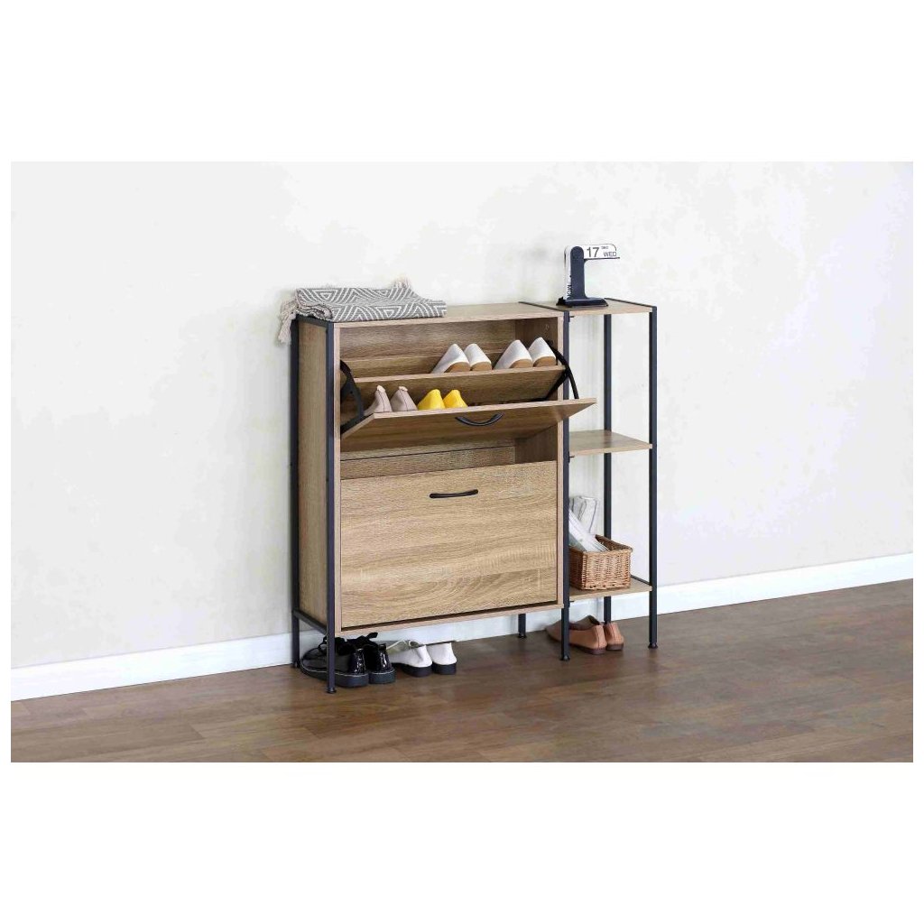 Tento botník vyniká nielen svojou estetikou, ale aj praktickými funkciami. S dvoma výklopnými šuplíkmi a policami ponúka dostatok priestoru na uloženie všetkých vašich obľúbených párov topánok, zatiaľ čo jeho robustná konštrukcia garantuje dlhú životnosť.