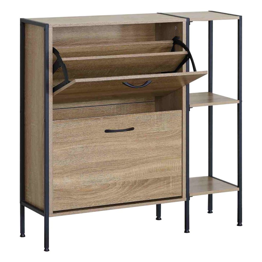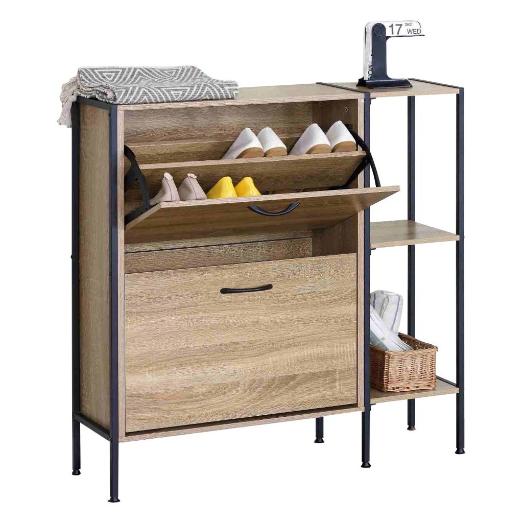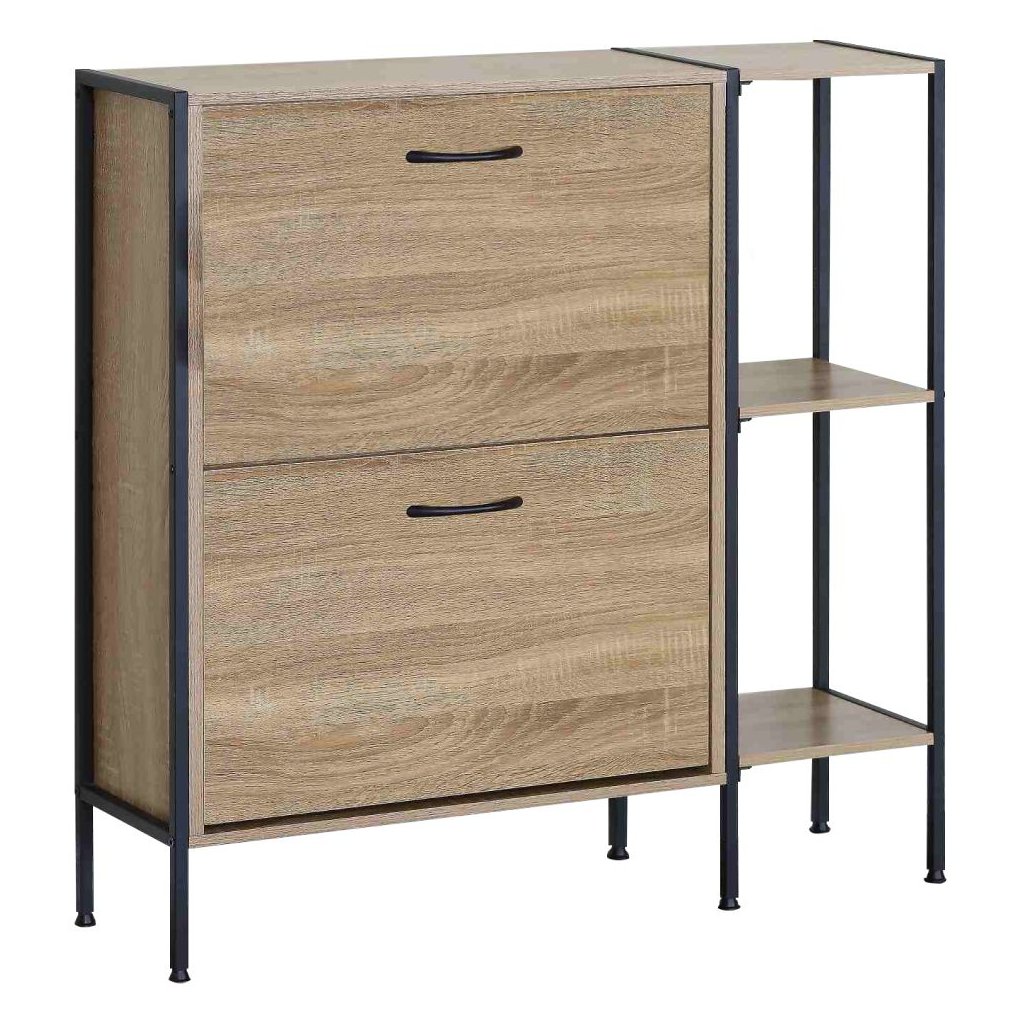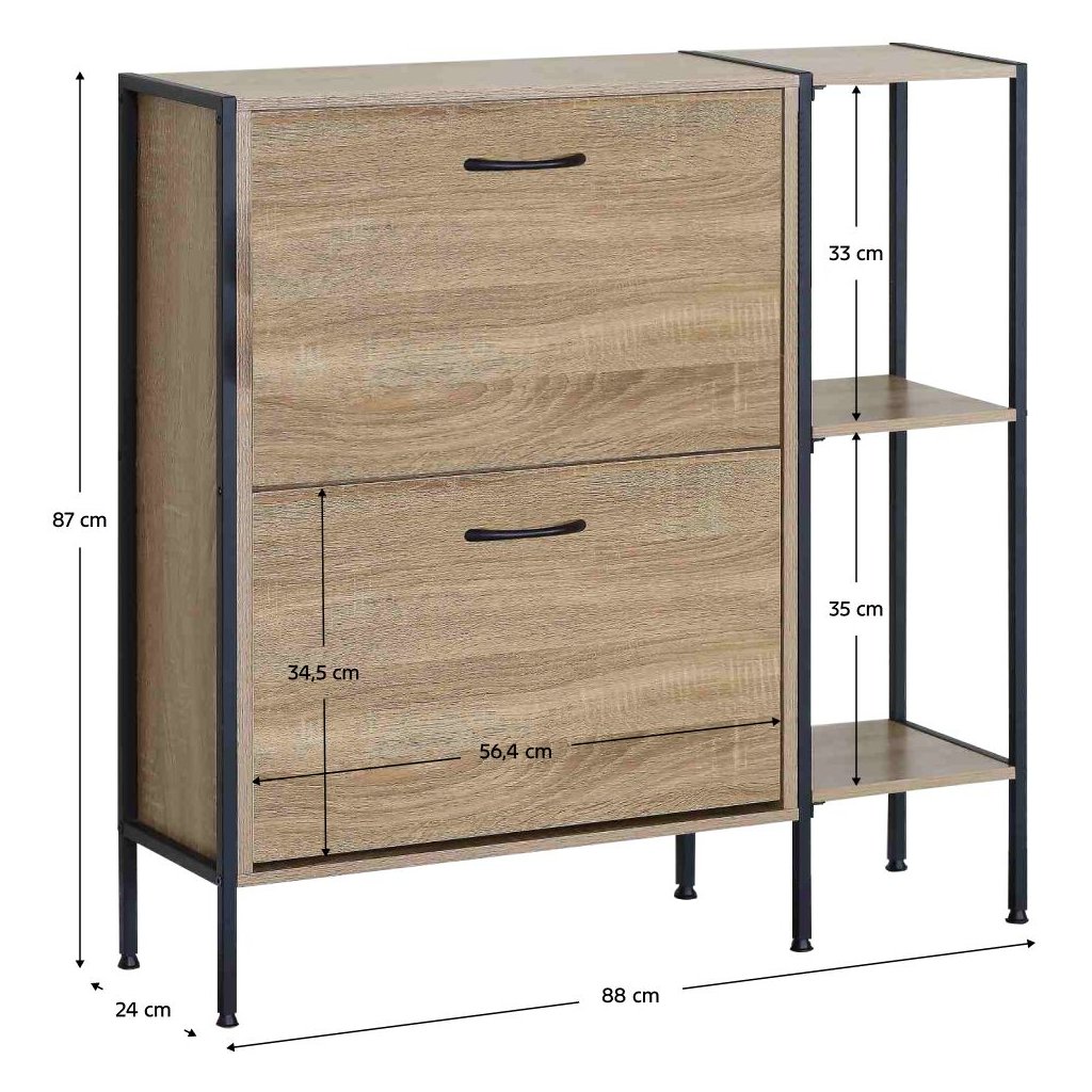 Tento botník vyniká nielen svojou estetikou, ale aj praktickými funkciami. S dvoma výklopnými šuplíkmi a policami ponúka dostatok priestoru na uloženie všetkých vašich obľúbených párov topánok, zatiaľ čo jeho robustná konštrukcia garantuje dlhú životnosť.