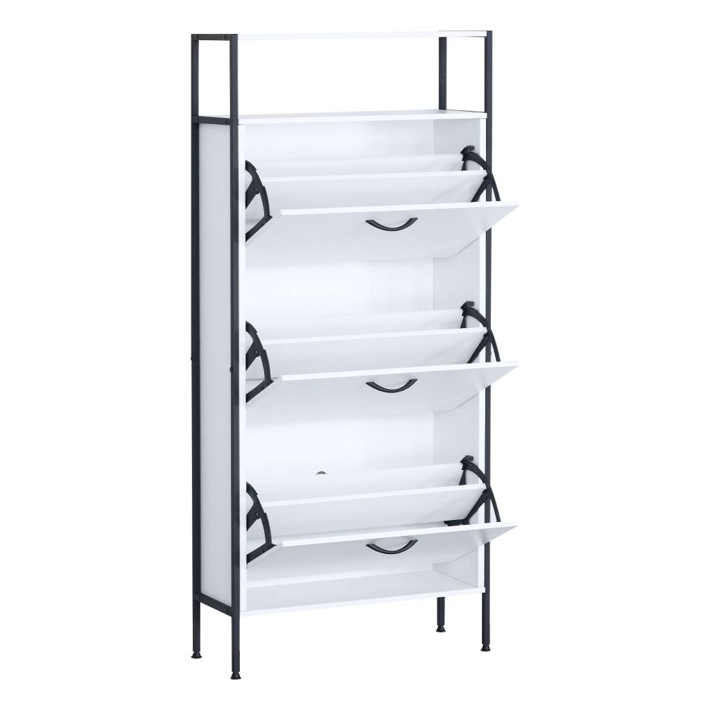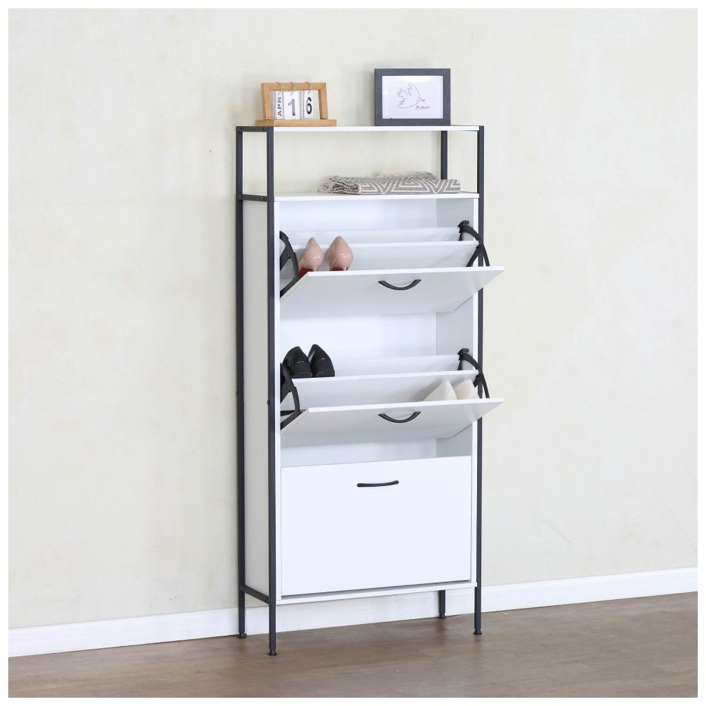 - Praktické usporiadanie: Tri výklopné šuplíky, ktoré sú rozdelené na dve časti, poskytujú dostatok priestoru pre rôzne typy obuvi.