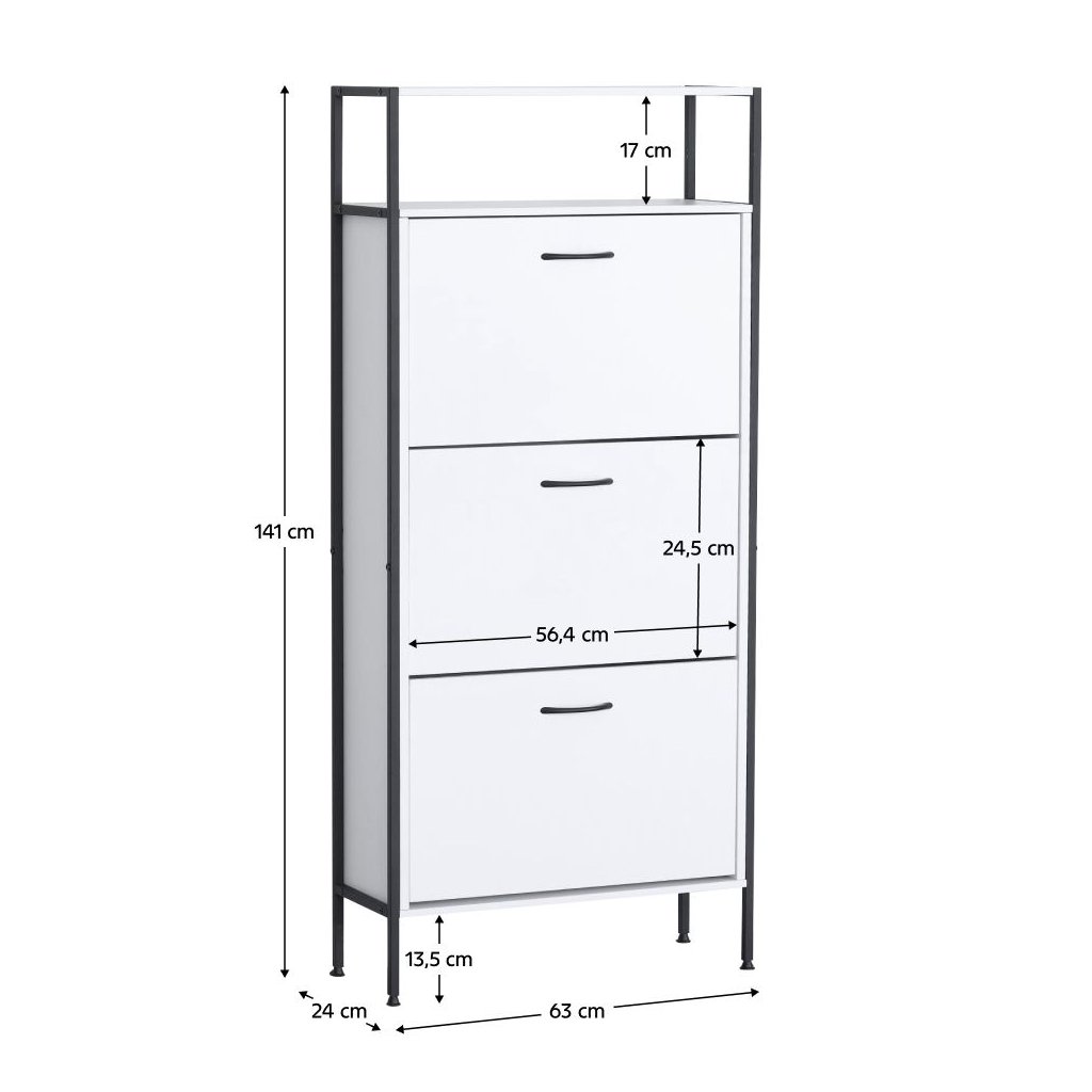 Biely botník s moderným dizajnom ponúka tri výklopné šuplíky a praktickú policu. Rozmery 63x24x141 cm, ideálny na úsporu miesta a organizáciu obuvi. Dodávané v demonte.