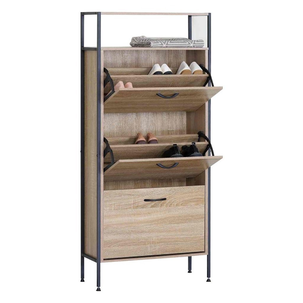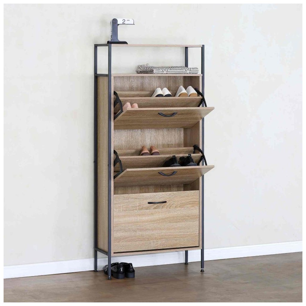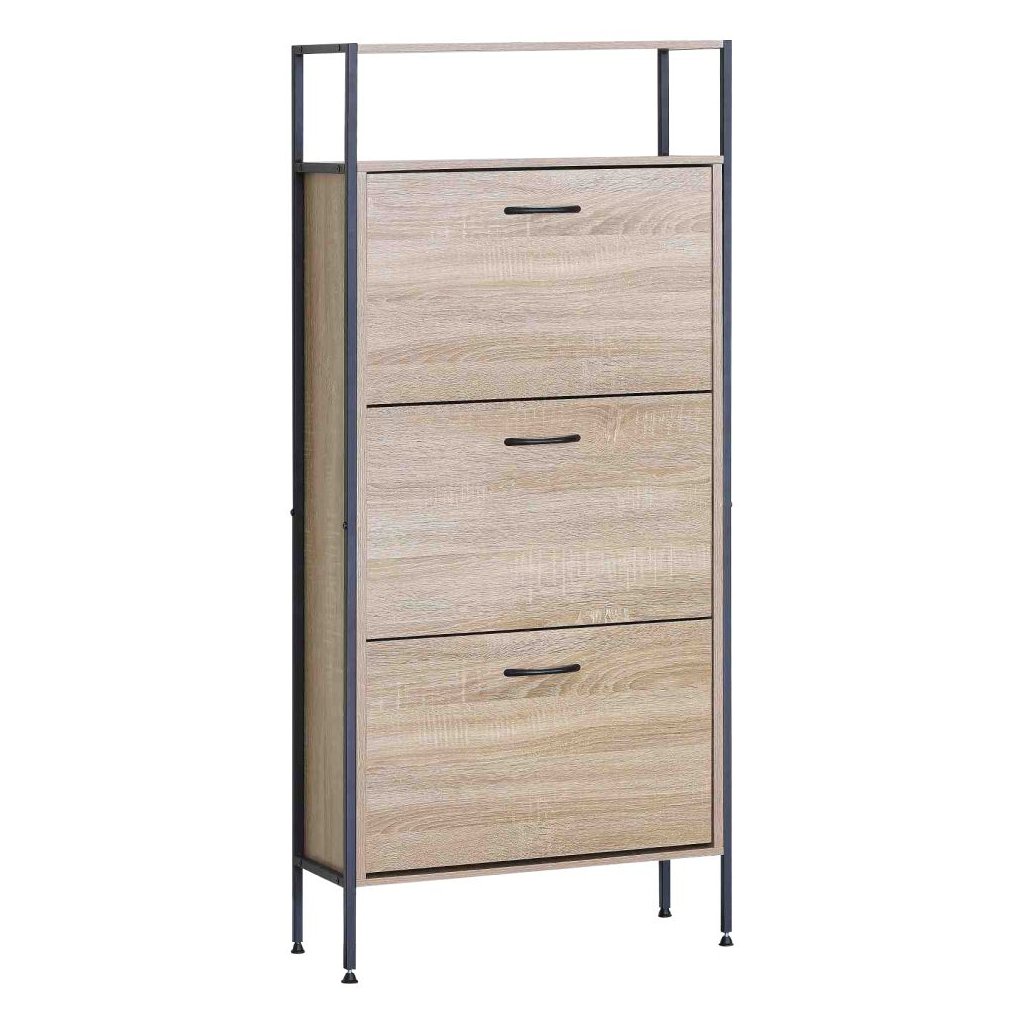 Vyrobený z kvalitnej drevotriesky, kombinovanej s oceľovými a plastovými prvkami, ponúka tento botník dostatok priestoru pre uskladnenie obuvi. S troch výklopnými šuplíkmi a policou na vrchu, poskytuje maximálnu variabilitu a pohodlie pri používaní.