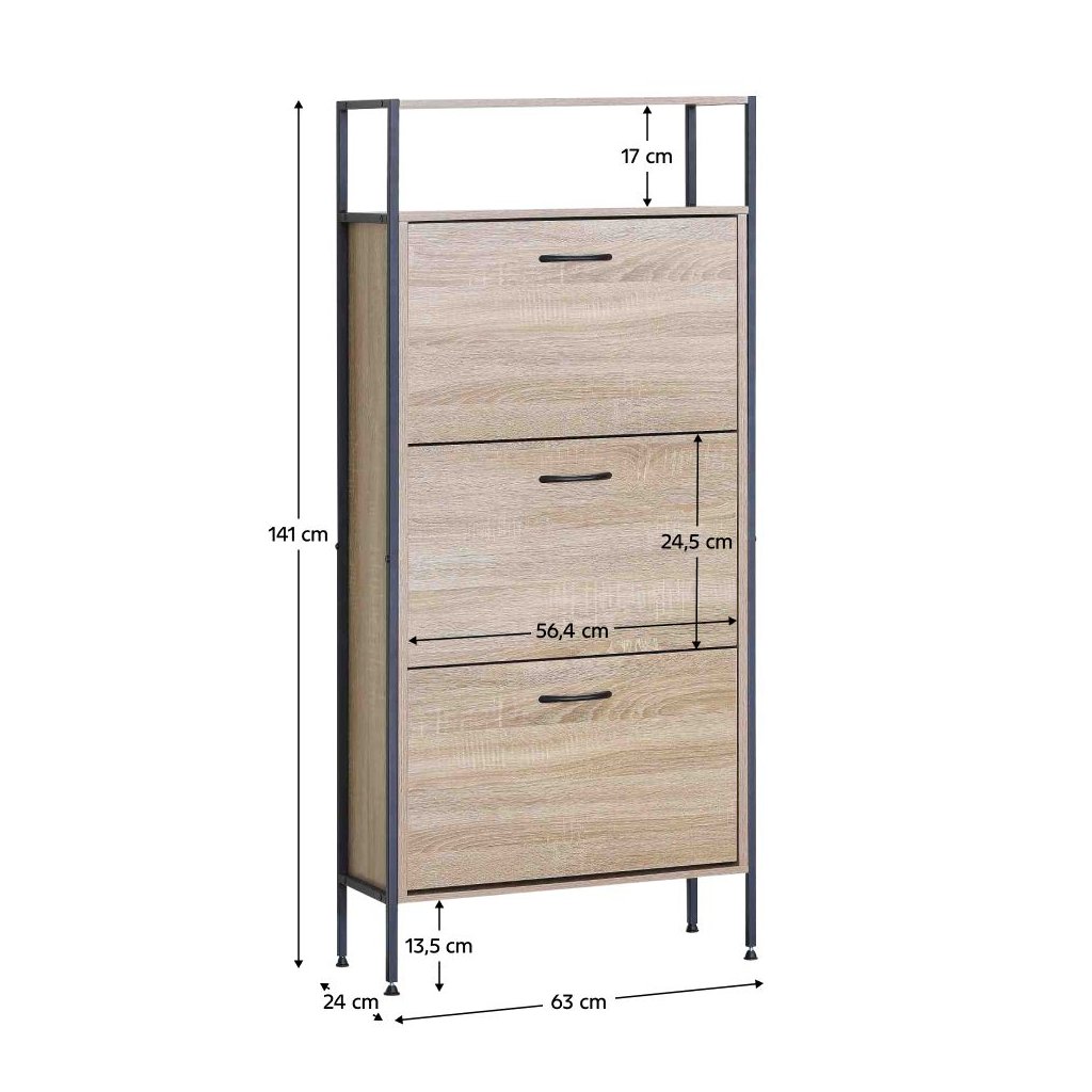 Botník v modernom dizajne z drevotriesky a ocele, farba dub/čierna. Obsahuje tri výklopné šuplíky a policu. Rozmery: 63x24x141 cm. Praktický a funkčný doplnok do každej predsiene. Dodávané v demonte.