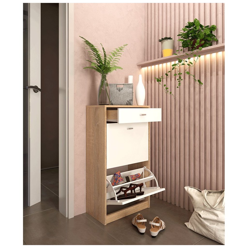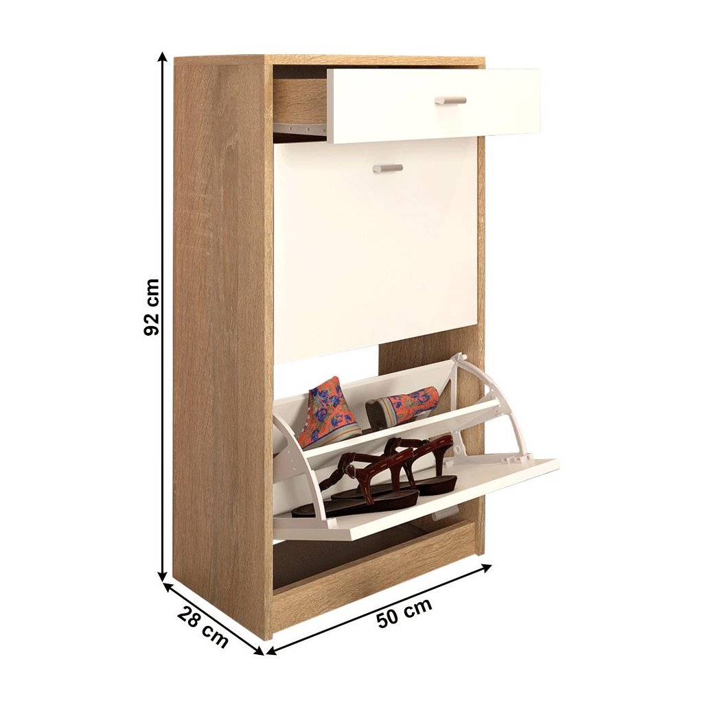 Dvojradový výklopný botník v kombinácii bielej a dubu sonoma ponúka praktické úložisko pre obuv. S jedným šuplíkom a rozmermi 50x28x92 cm je ideálnym riešením do každej predsiene. Dodávané v demonte.