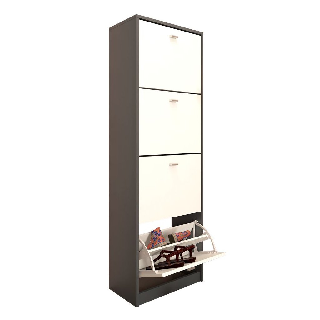 Praktický botník v grafitovo-bielej farbe ponúka štyri výklopné úložné priestory. Rozmery 50x28x152 cm a hrúbka materiálu 16 mm zabezpečujú stabilitu a dostatok miesta pre obuv. Dodávané v demonte.