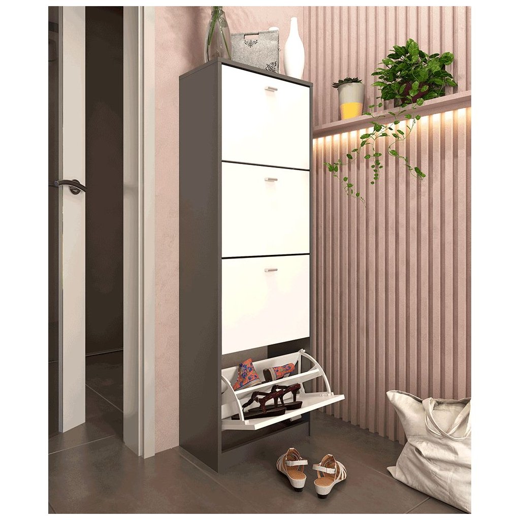 Botník VIVAT 3 v elegantnej kombinácii grafitovej a bielej farby je ideálnym riešením pre efektívne uskladnenie obuvi v každom domove. Jeho moderný dizajn a praktické vyhotovenie sa dokonale hodia do rôznych interiérov, či už ide o predsieň, chodbu alebo izbu.