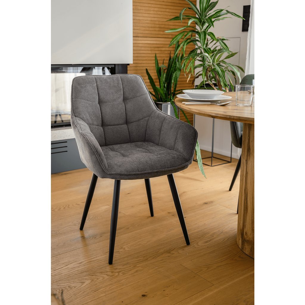 Stabilitu kresla zabezpečujú robustné kovové nohy v čiernej farbe, ktoré mu dodávajú moderný vzhľad a zaručujú dlhotrvajúcu odolnosť. Príjemné sedenie umocňujú dekoratívne prešité opierky na ruky a chrbtová opierka, ktoré sú navrhnuté tak, aby ponúkali maximálny komfort a podporu.