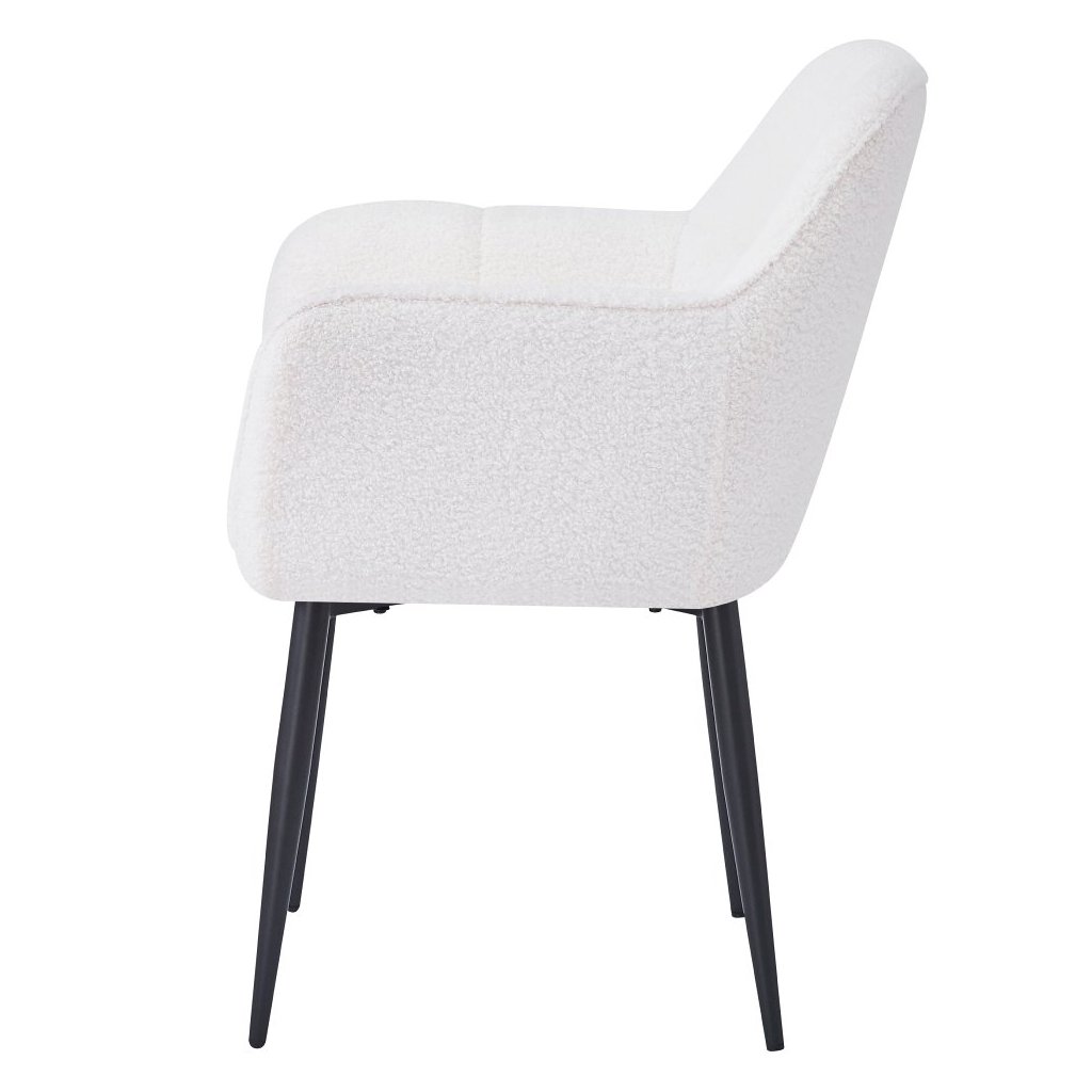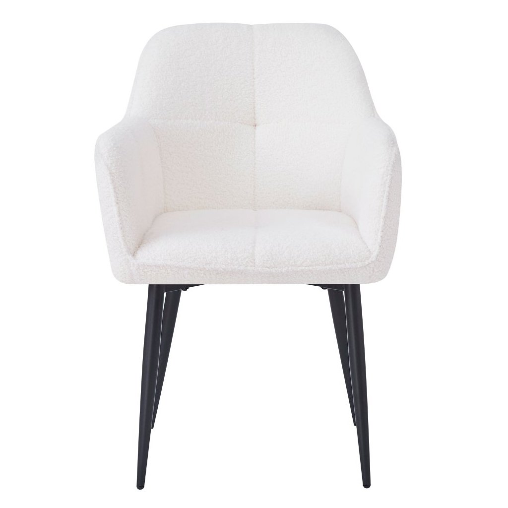 Čalúnené je odolnou bielou látkou bouclé, pričom čierne kovové nohy zaručujú stabilitu a kontrast s jemným povrchom. Tvarované operadlo s pohodlnými opierkami na ruky poskytuje maximálnu oporu, čím zaručuje príjemný zážitok počas každodenného sedenia.