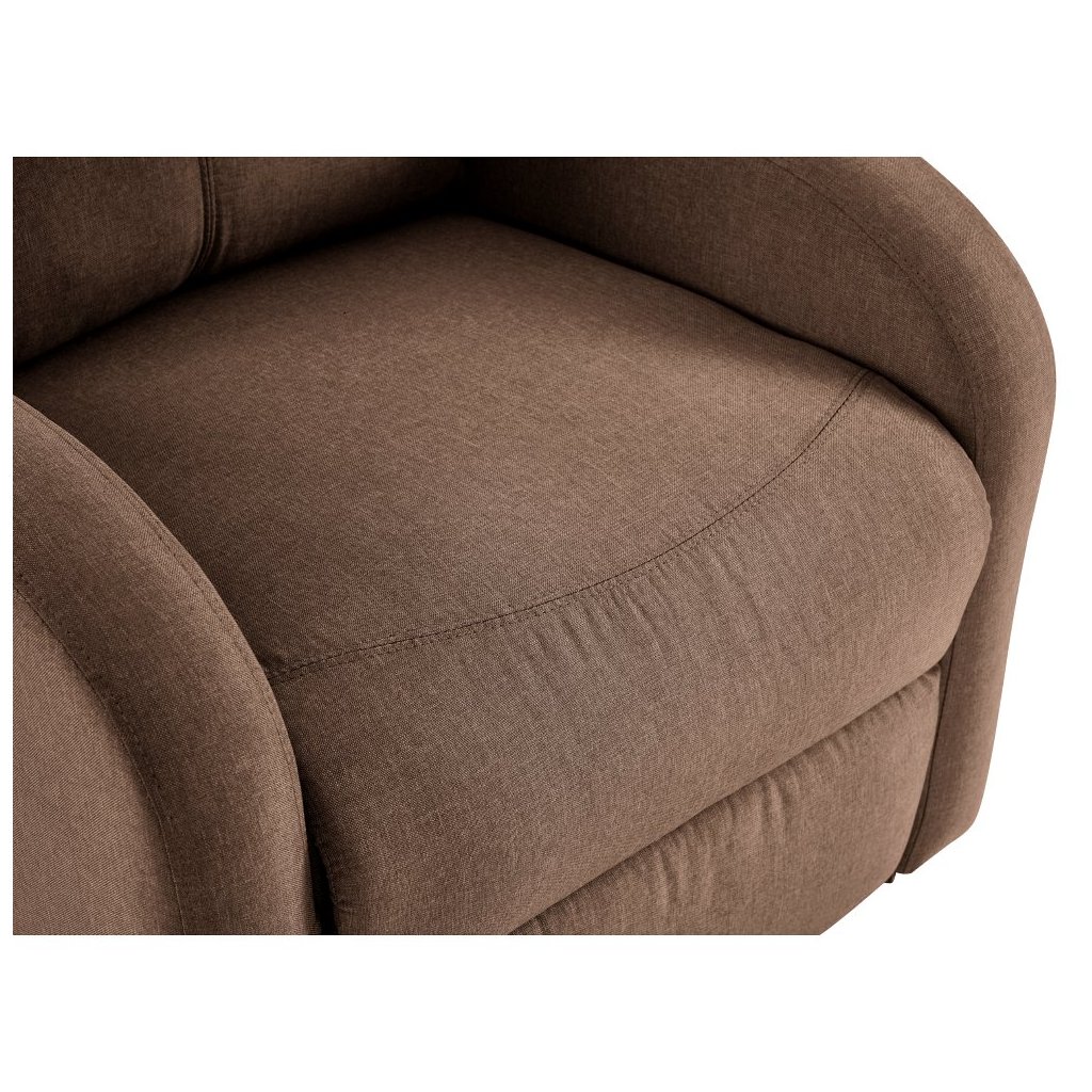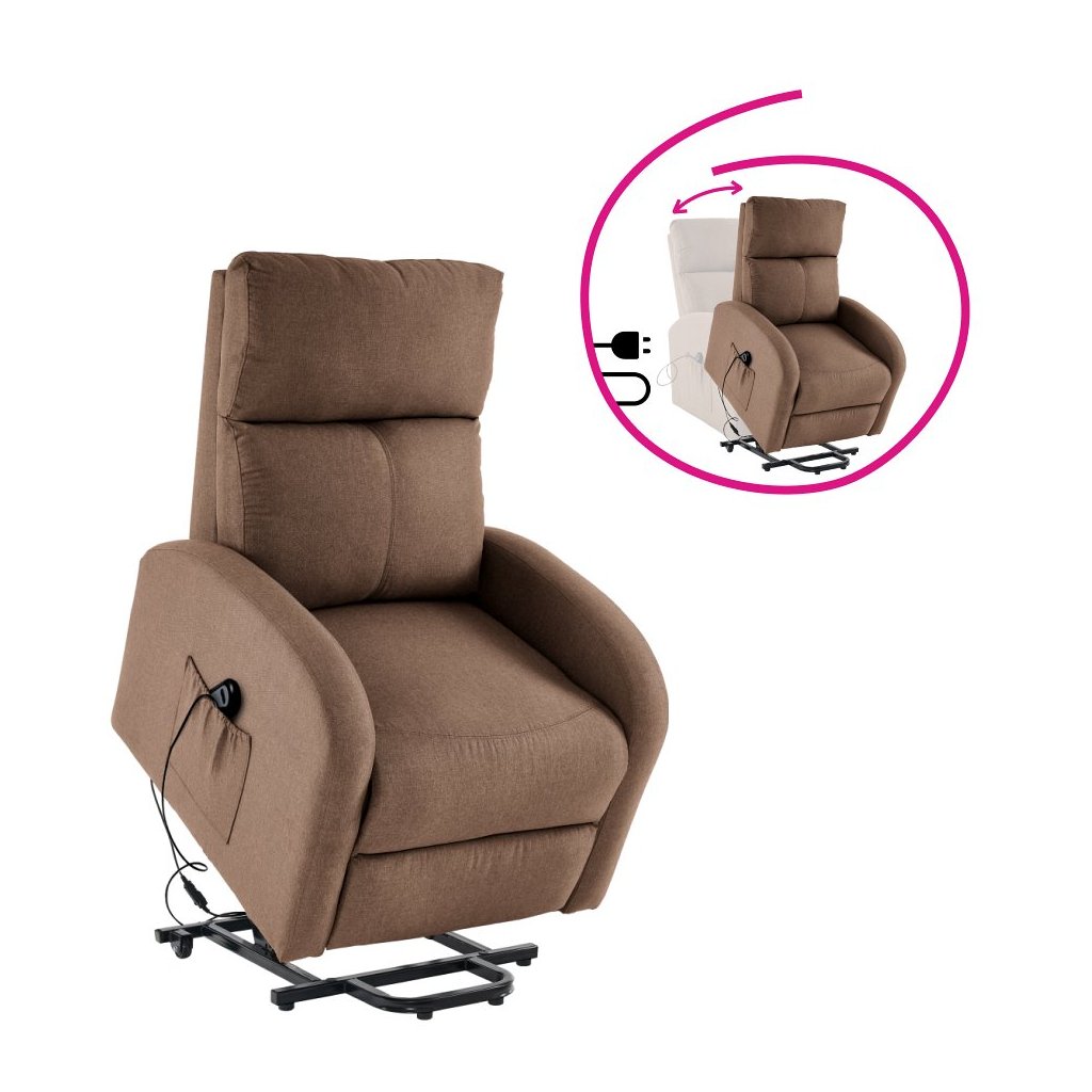 Elektricky polohovacie kreslo NERIS v hnedé látke kombinuje moderný dizajn s praktickými funkciami. Umožňuje jednoduché vstávanie a relaxáciu, ponúka pohodlné sedenie a úložný priestor.