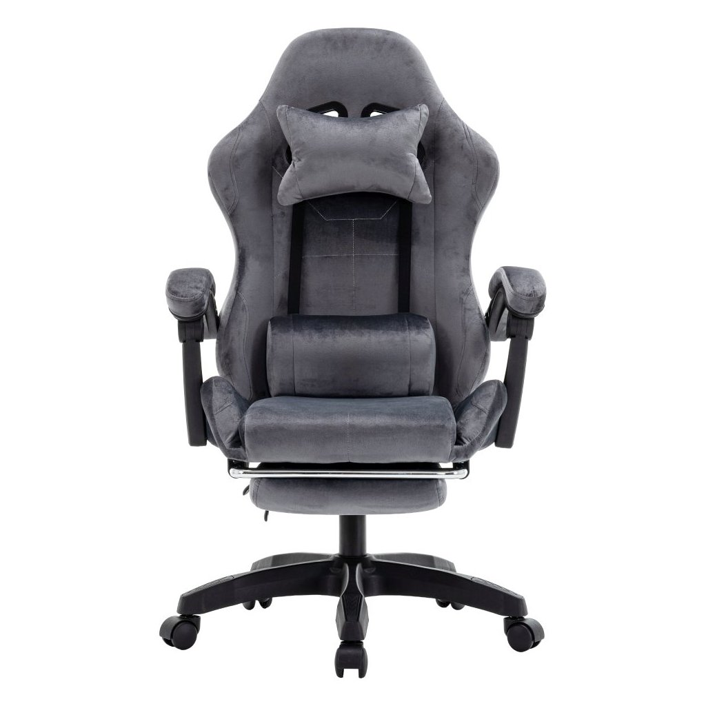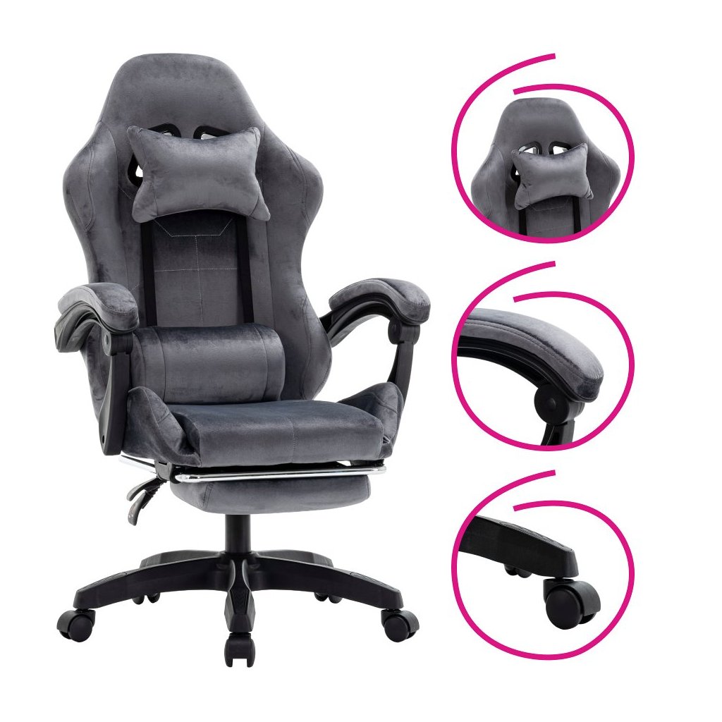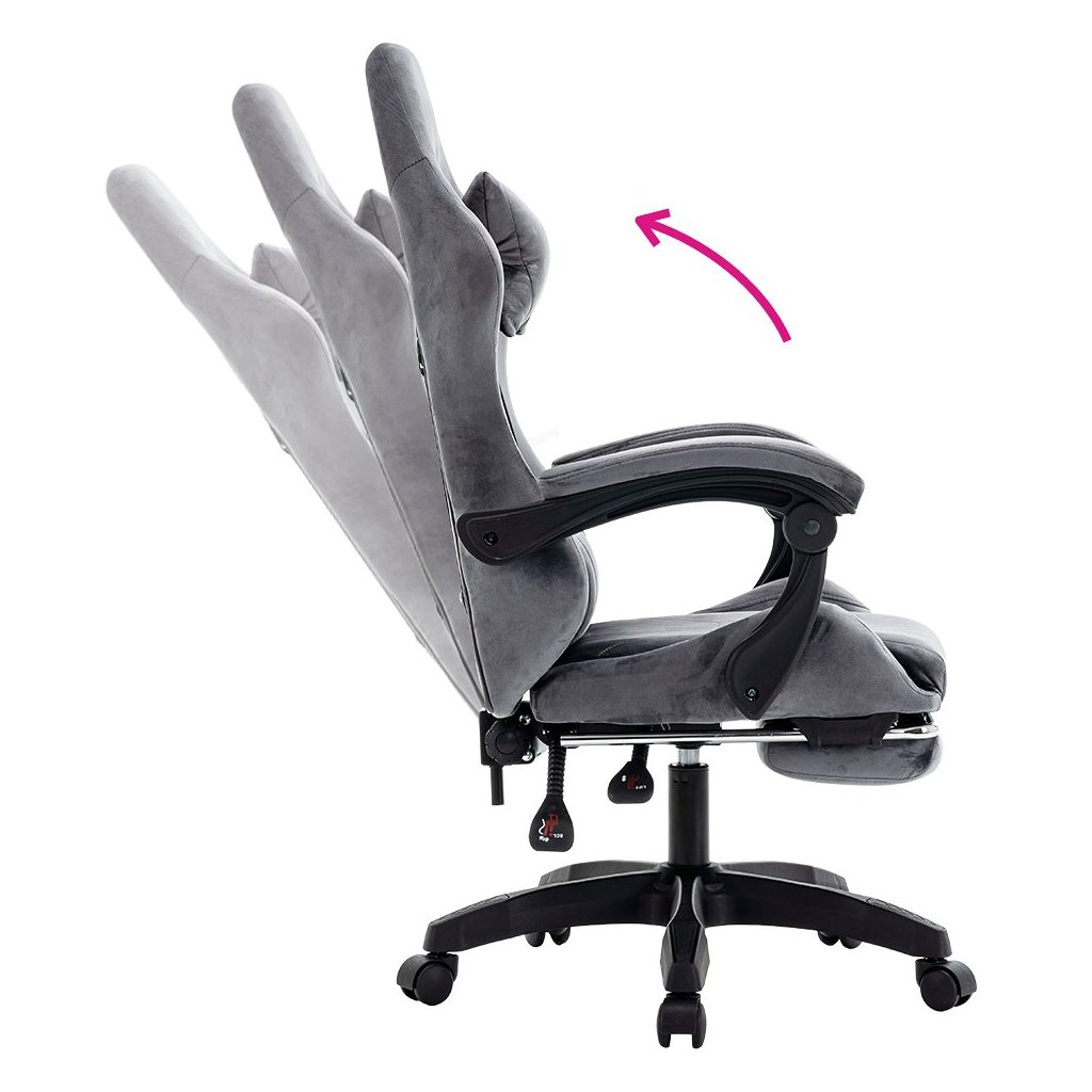 Herné kreslo LOPES v sivej látke kombinuje moderný dizajn s maximálnym komfortom. Nastaviteľné opierky a výsuvná podnož zabezpečujú oporu pri práci aj hre. Univerzálne kolieska umožňujú hladký pohyb n