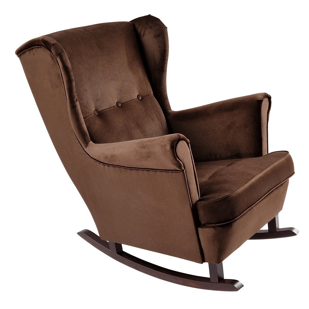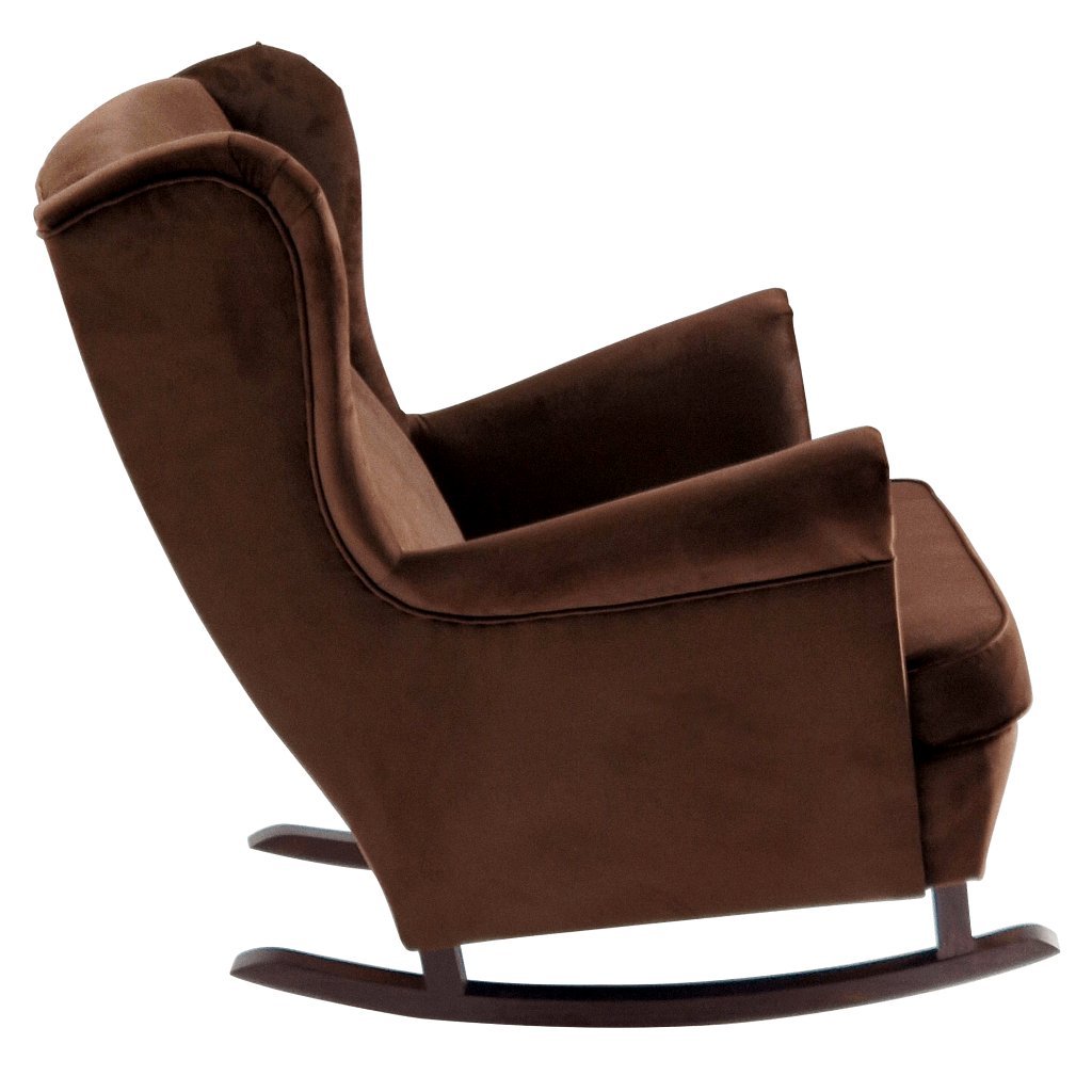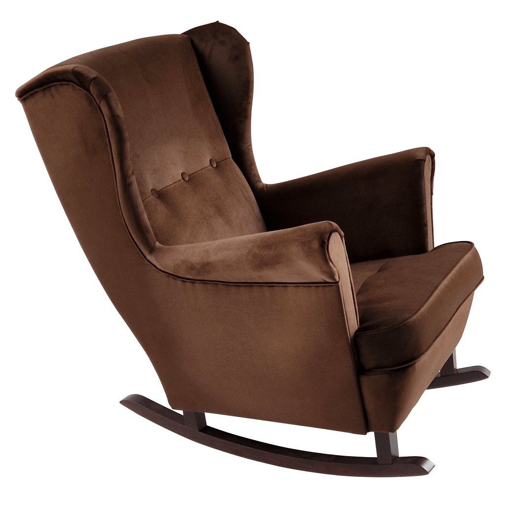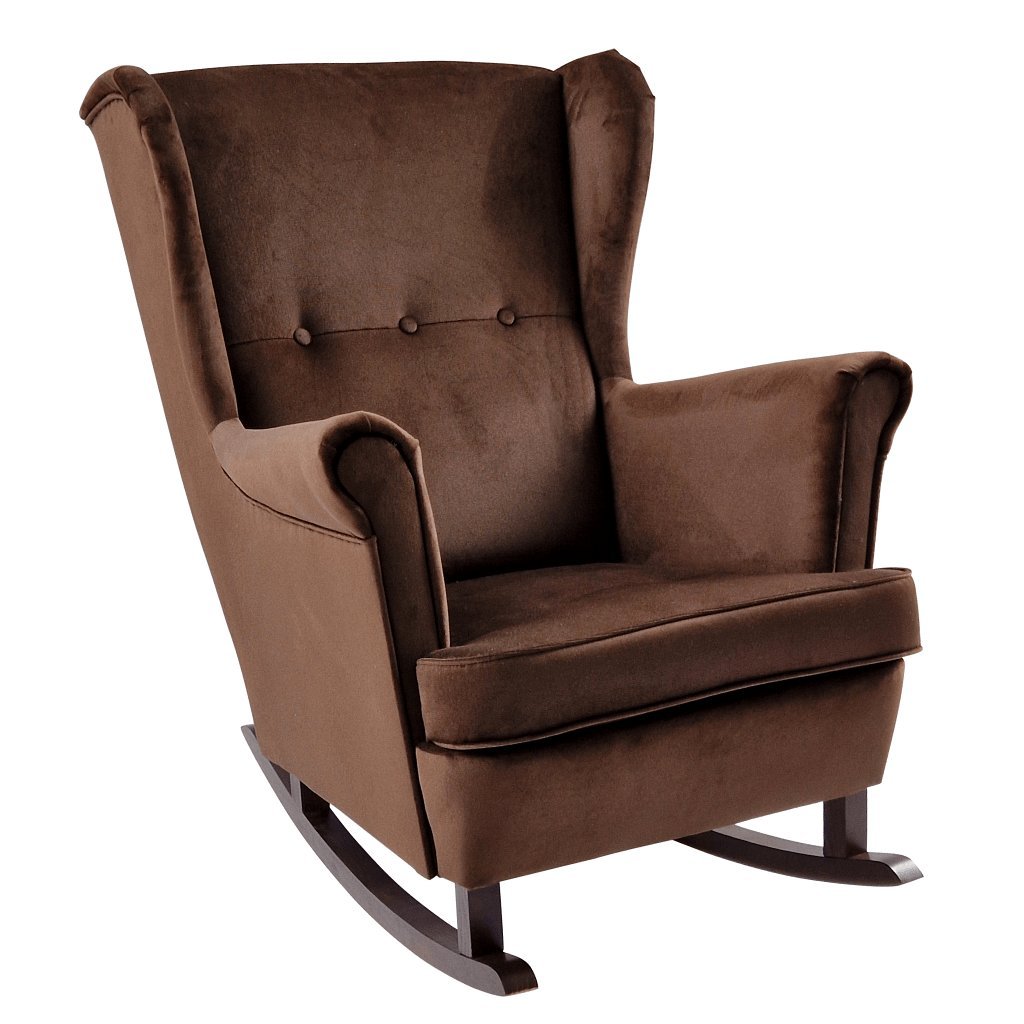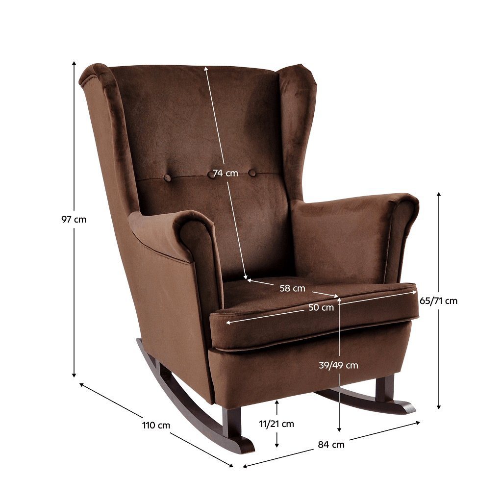 Hojdacie kreslo TEJA v hnedej látke kombinuje pohodlie a štýlový dizajn. Vysoká opierka a mohutné opierky rúk zabezpečujú dokonalé uvoľnenie. Stabilné drevené nožičky dodávajú eleganciu.