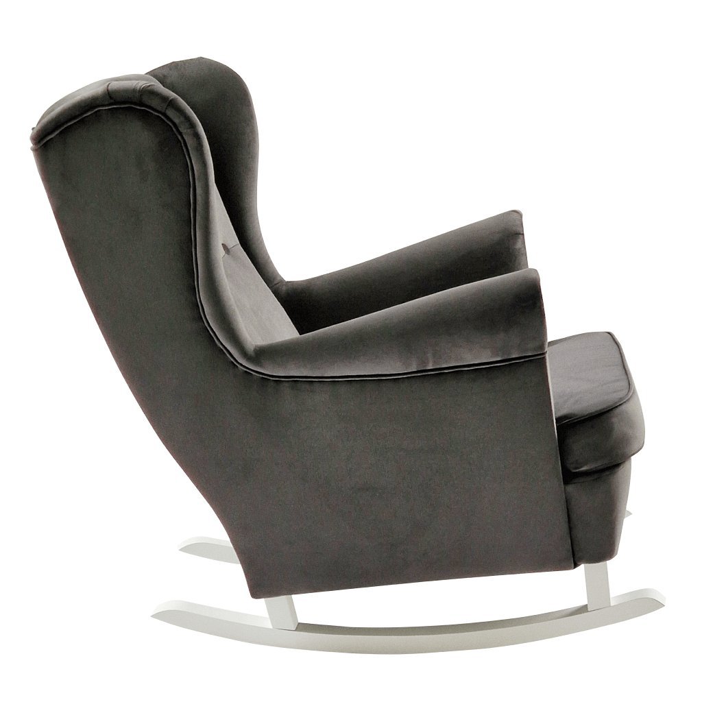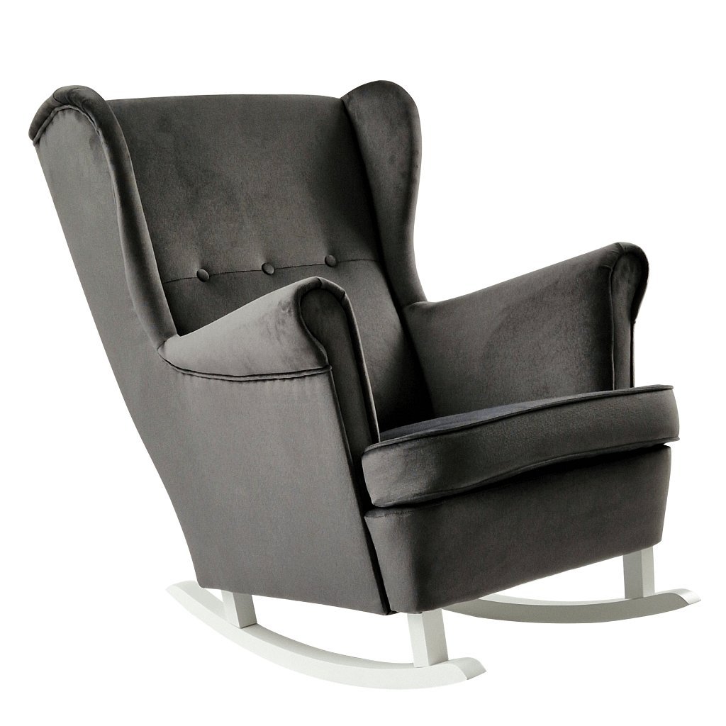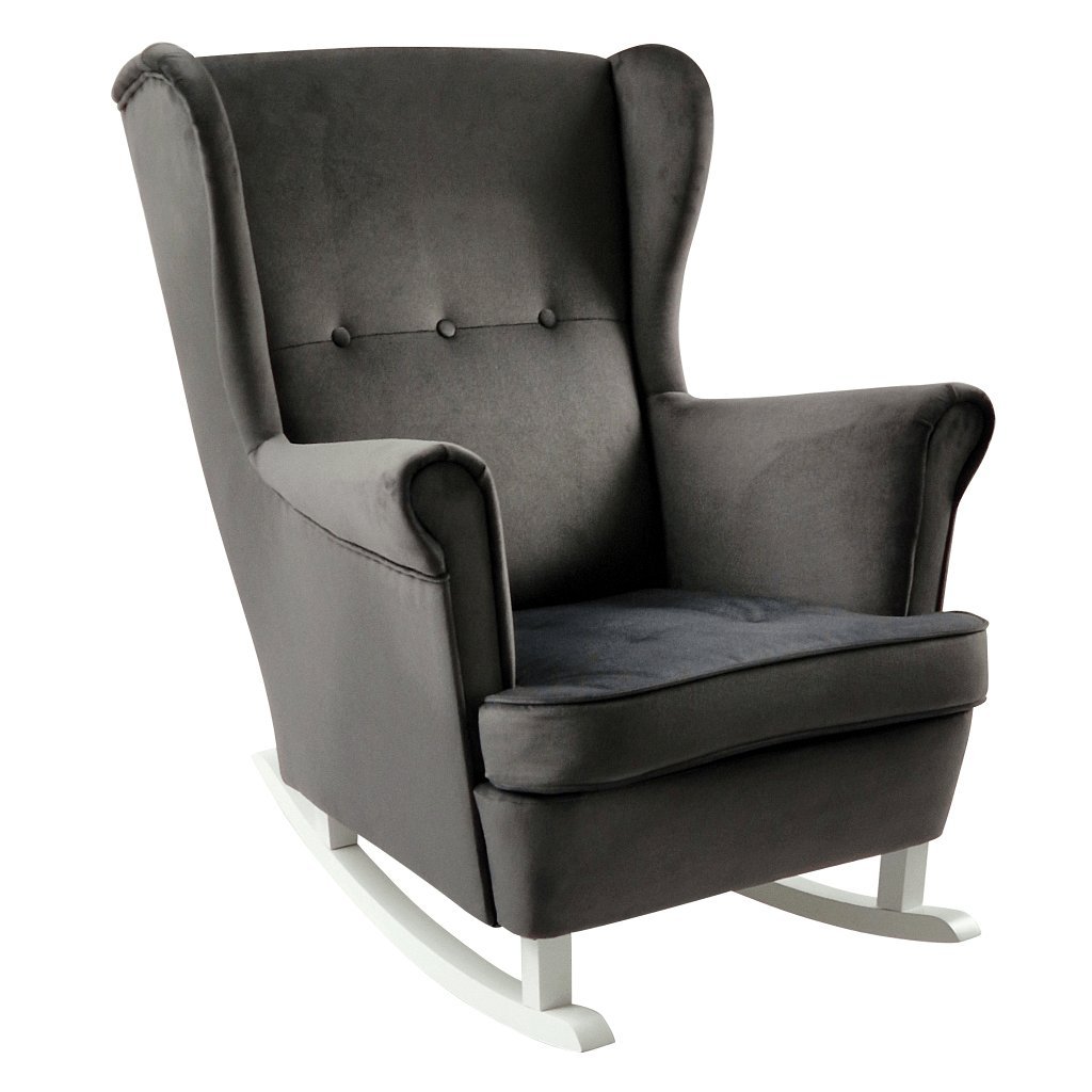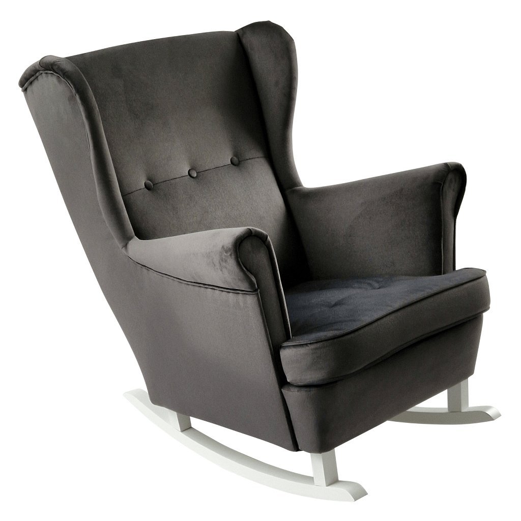 Hojdacie kreslo TEJA v tmavosivej látke kombinuje pohodlie a štýlový dizajn. S vysokou opierkou a mäkkými bočnými "ušiakmi" ponúka ideálne miesto na relax. Stabilné drevené nožičky zaisťujú bezpečné h