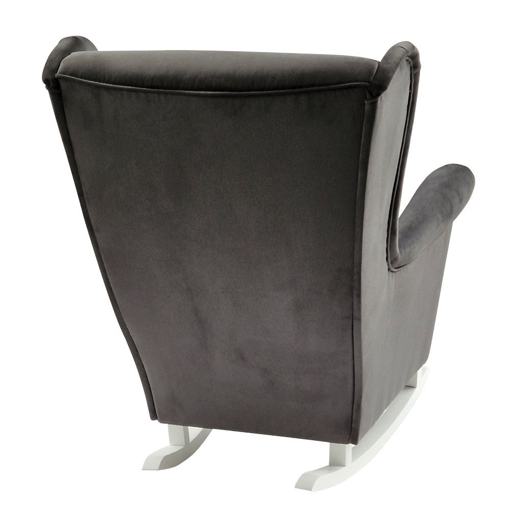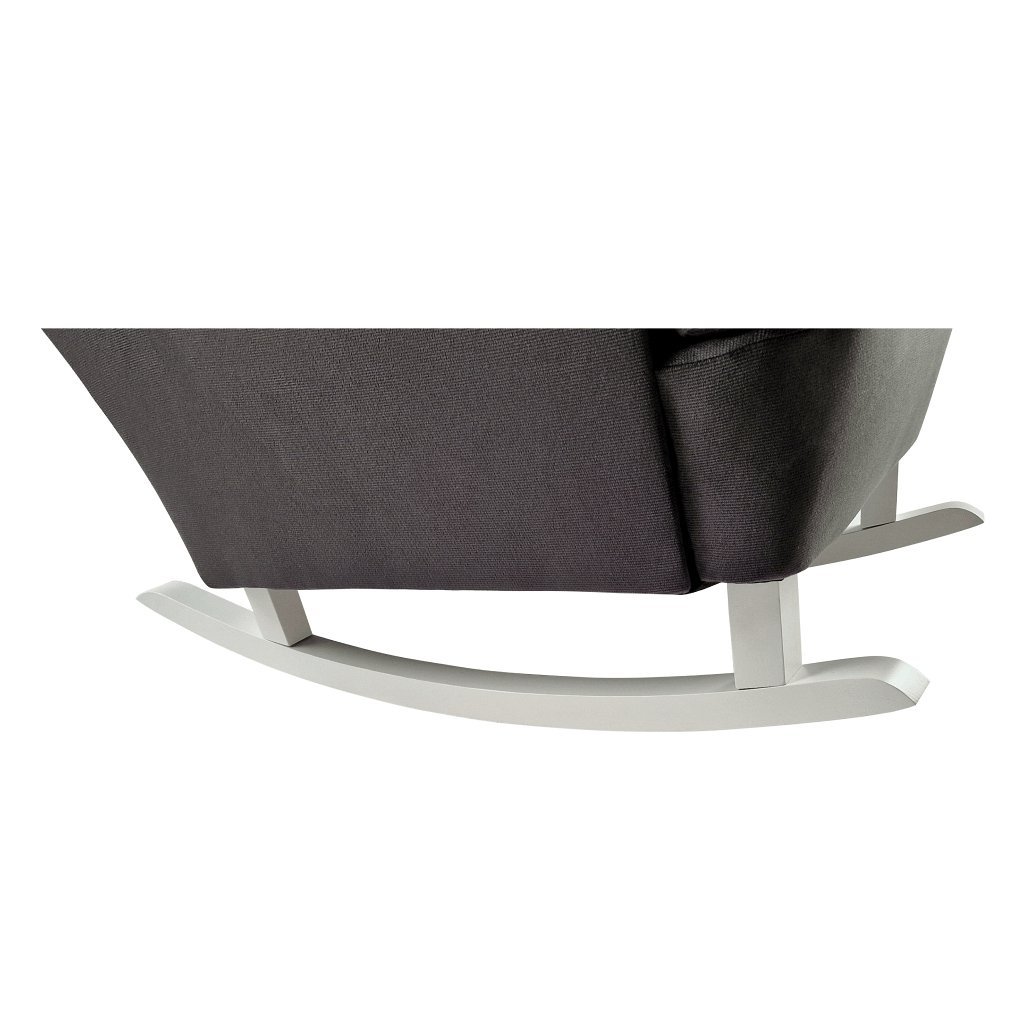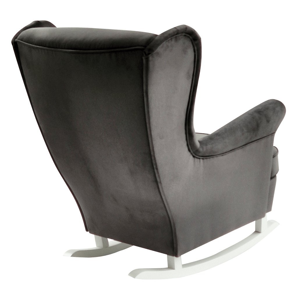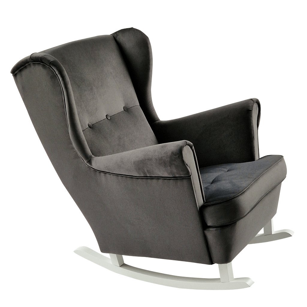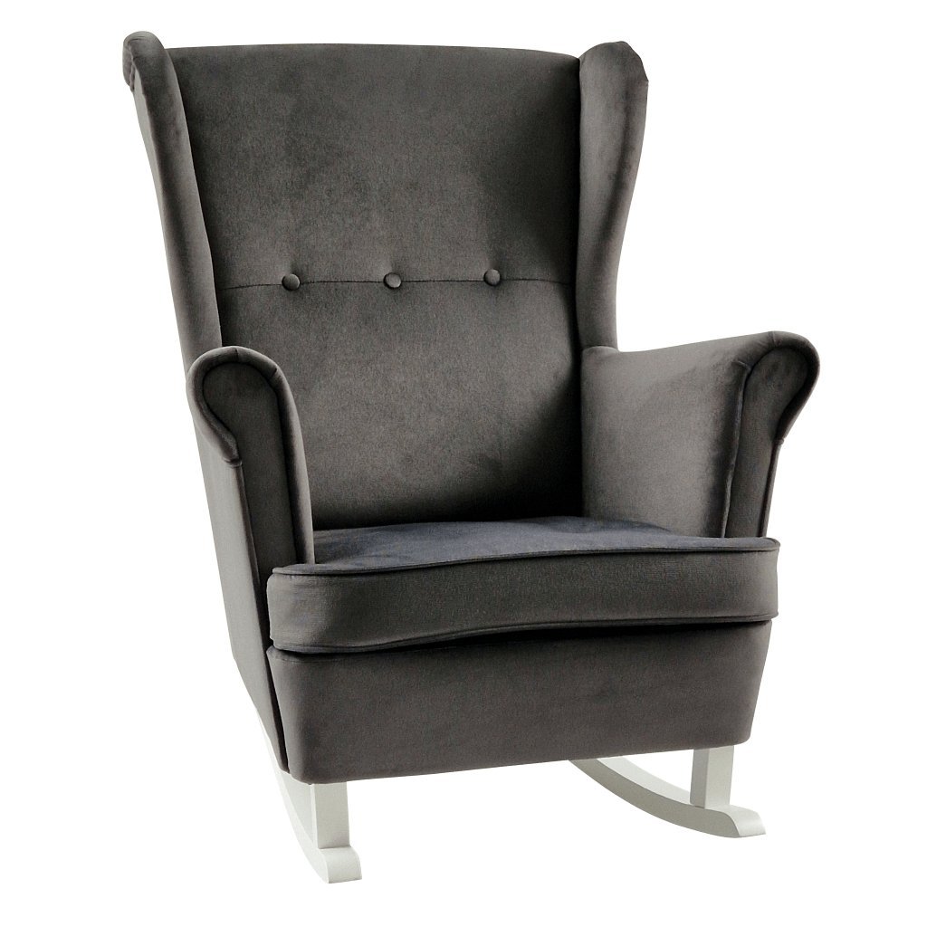 Hojdacie kreslo TEJA v tmavosivej látke kombinuje pohodlie a štýlový dizajn. S vysokou opierkou a mäkkými bočnými "ušiakmi" ponúka ideálne miesto na relax. Stabilné drevené nožičky zaisťujú bezpečné h